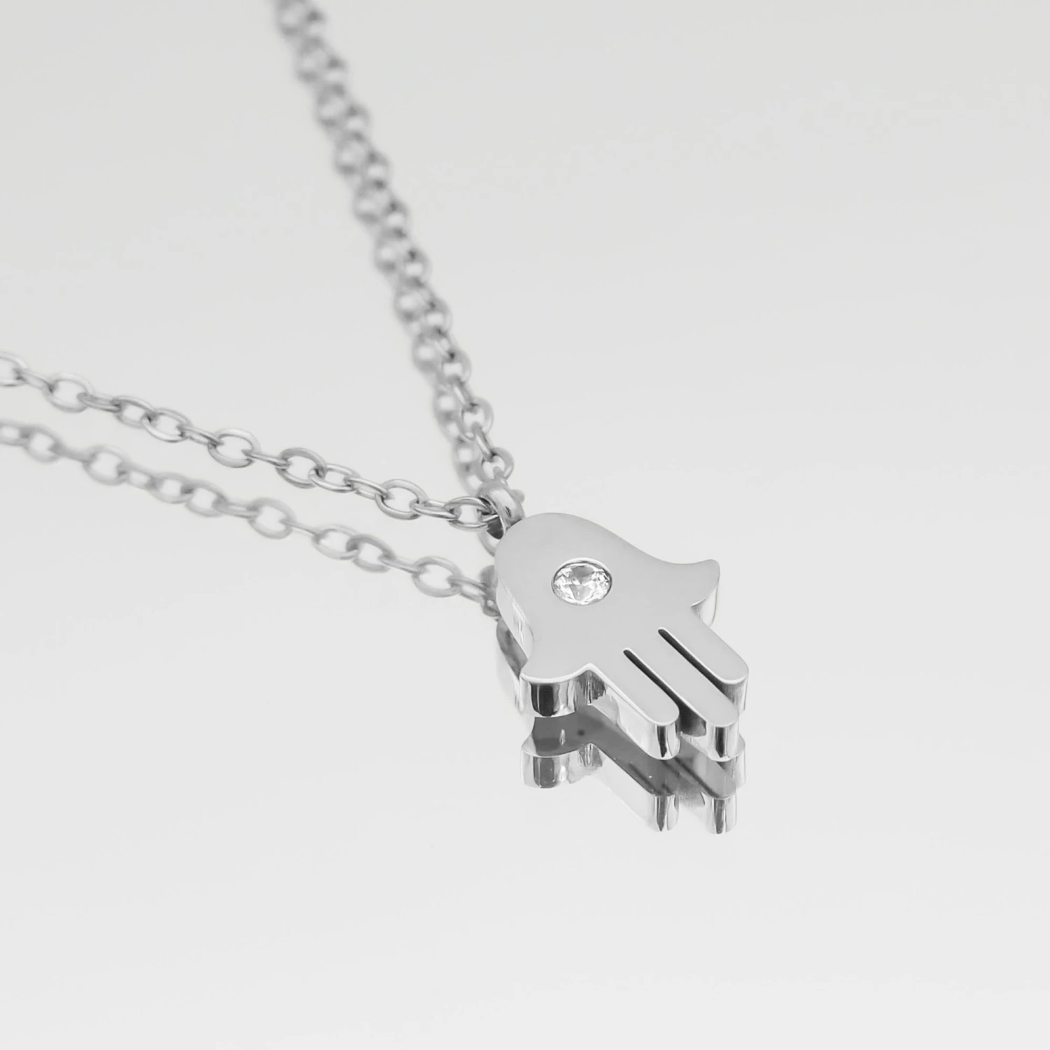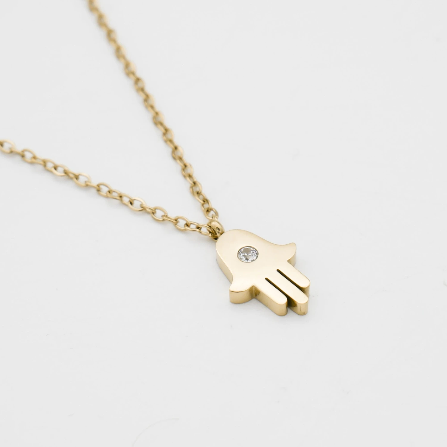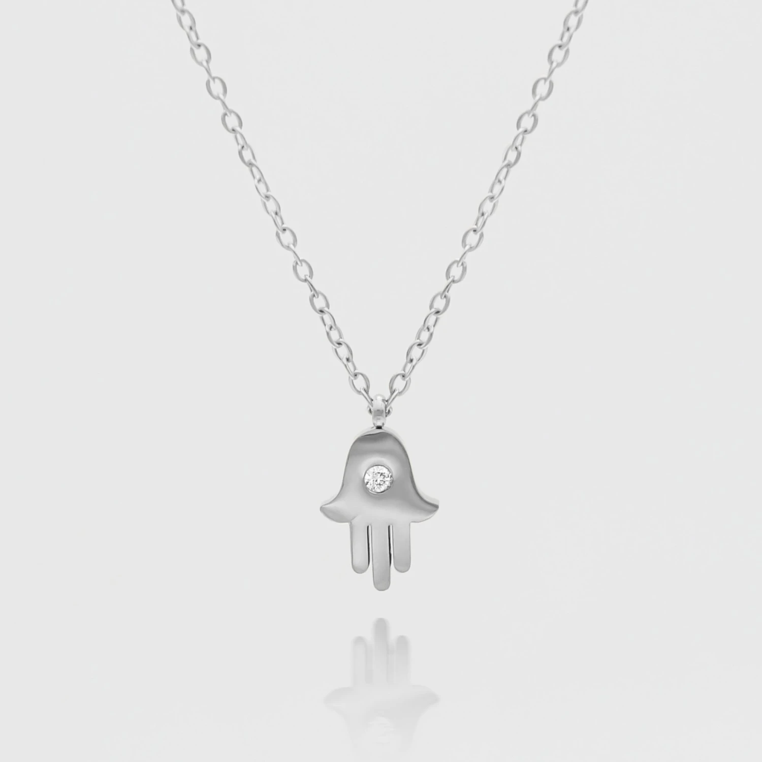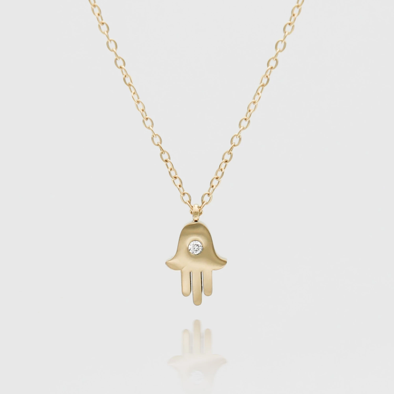 This beautiful Amalie Hand of Hamsa necklace features the classic hand of Hamsa design, with a CZ diamond at the centre for a touch of sparkle. Crafted from quality gold and silver, it is sure to stand out and add a touch of elegance to your wardrobe. The iconic Hamsa symbol brings good luck, protection, and health to those who wear it.