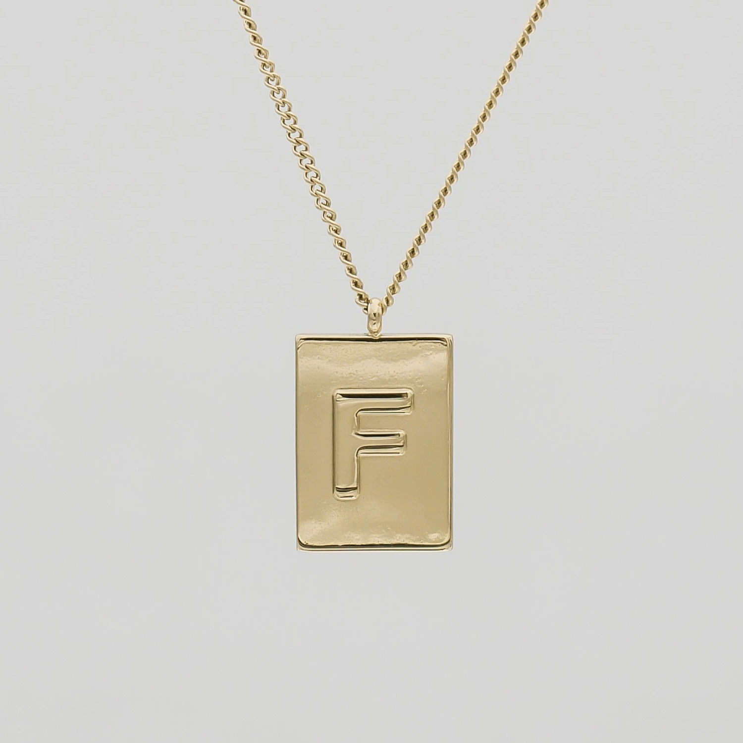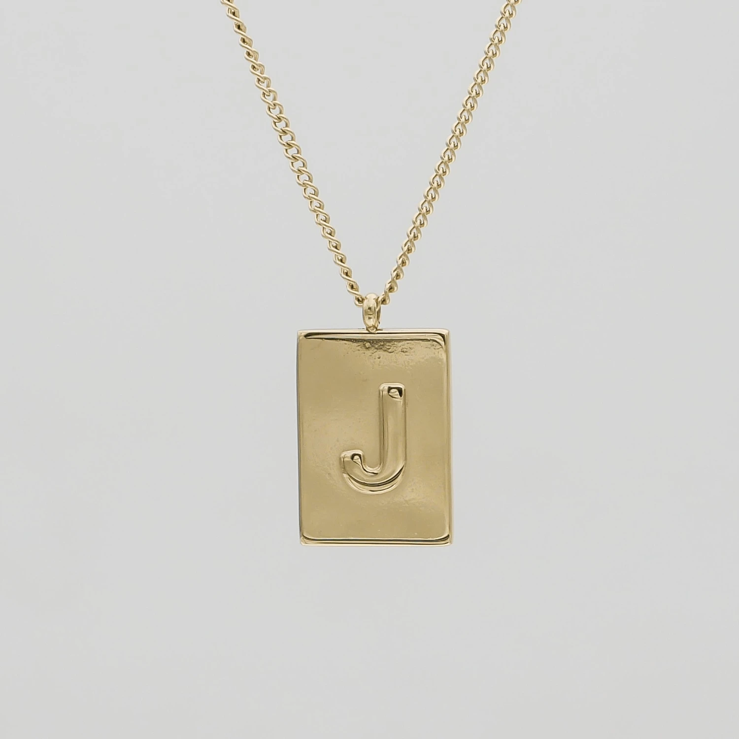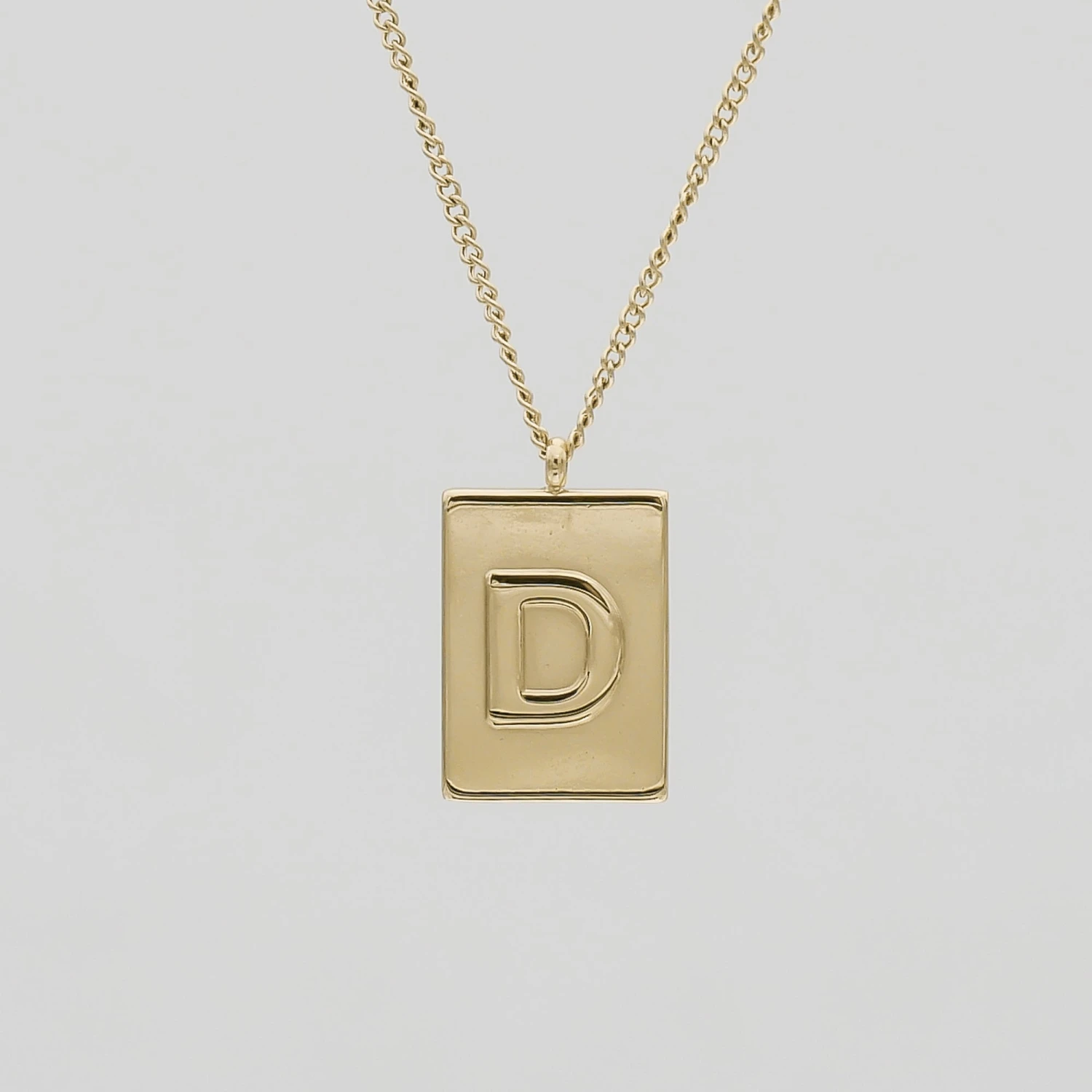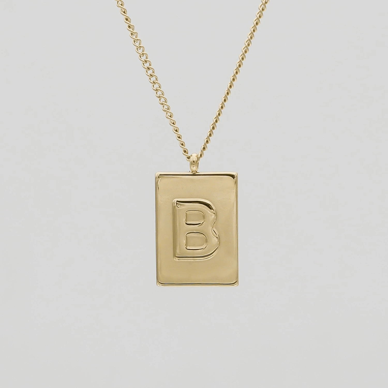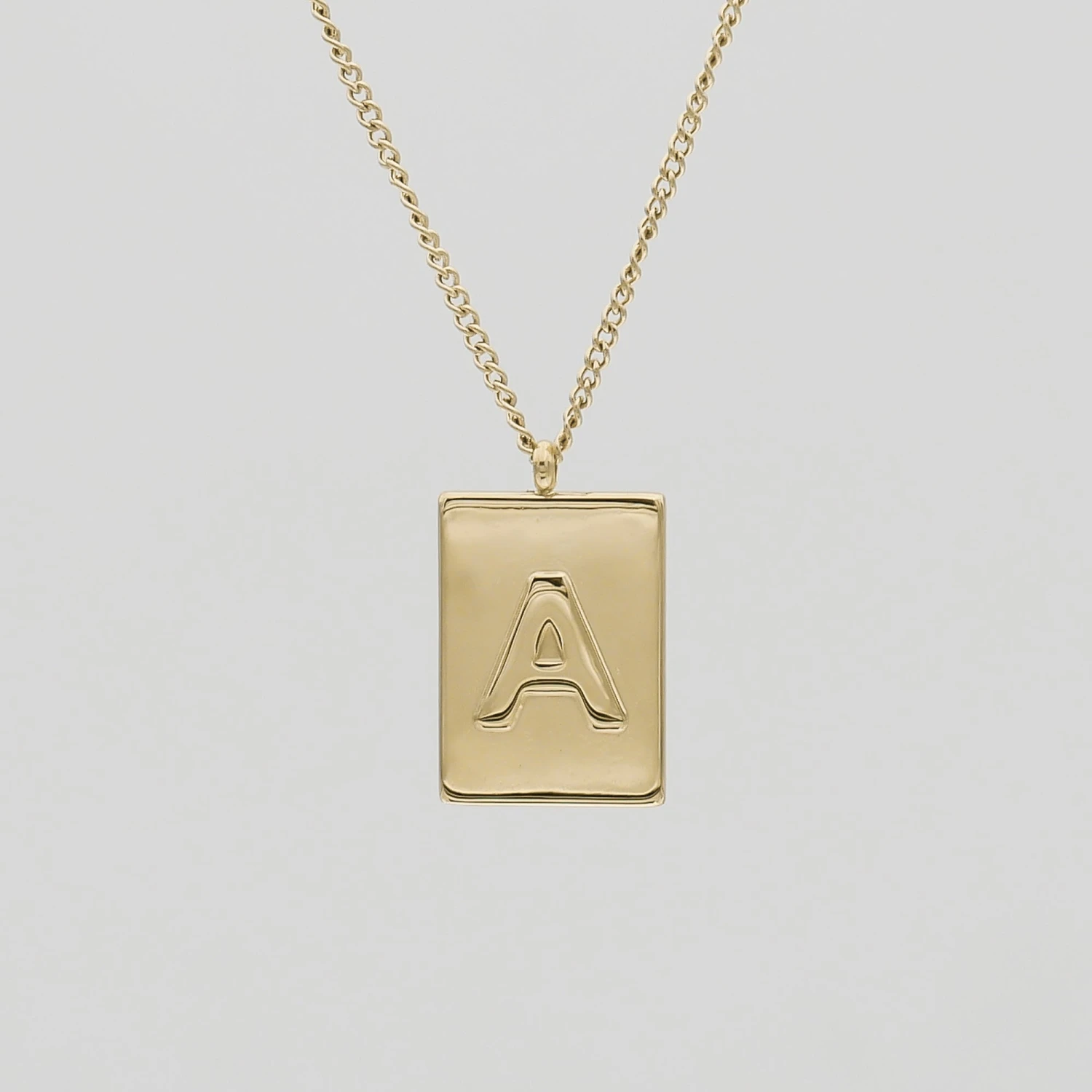 The necklace uses a traditional link chain that has miniature loops, keeping all the attention on the main interest, the tablet pendant. The pendant is attached to the chain with a rounded metal bail which attaches directly to the tablet. The tablet is made from 18K gold plated stainless steel and is rectangular in shape. It is very thin in-depth, only 2mm, and has a slightly bevelled edge. The initial letter you have chosen is embossed in the centre of the tablet, with the surface of the letter slightly raised. The initial is featured as a capitalised letter with a block font style making the initial easy to read.