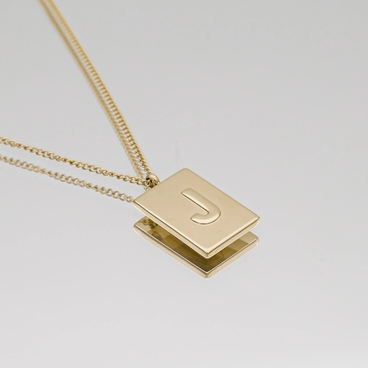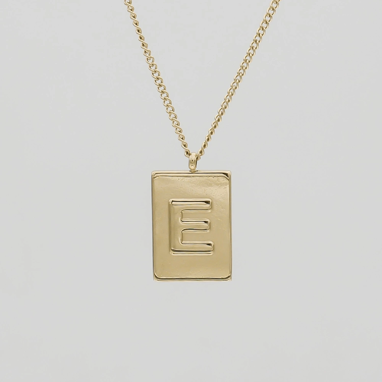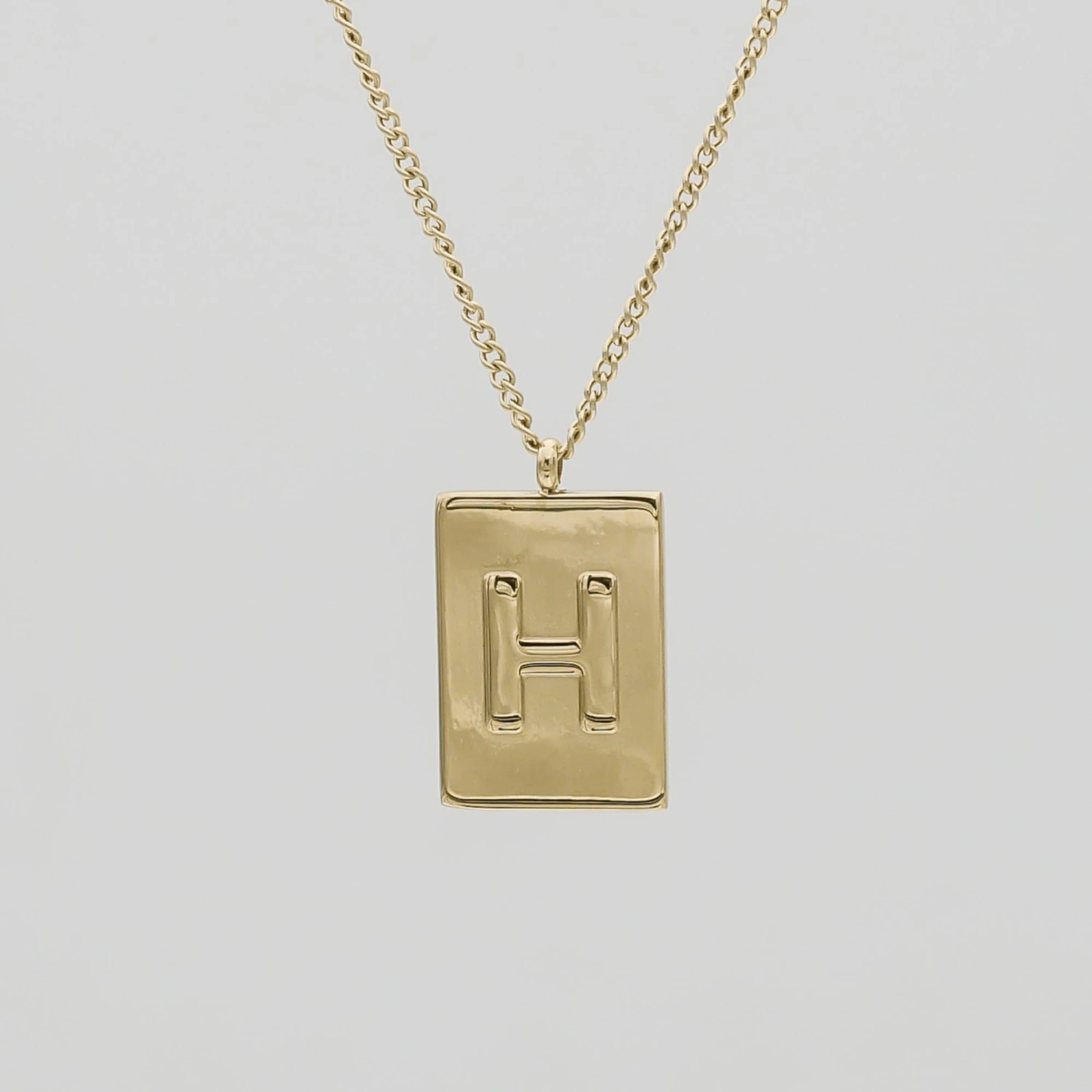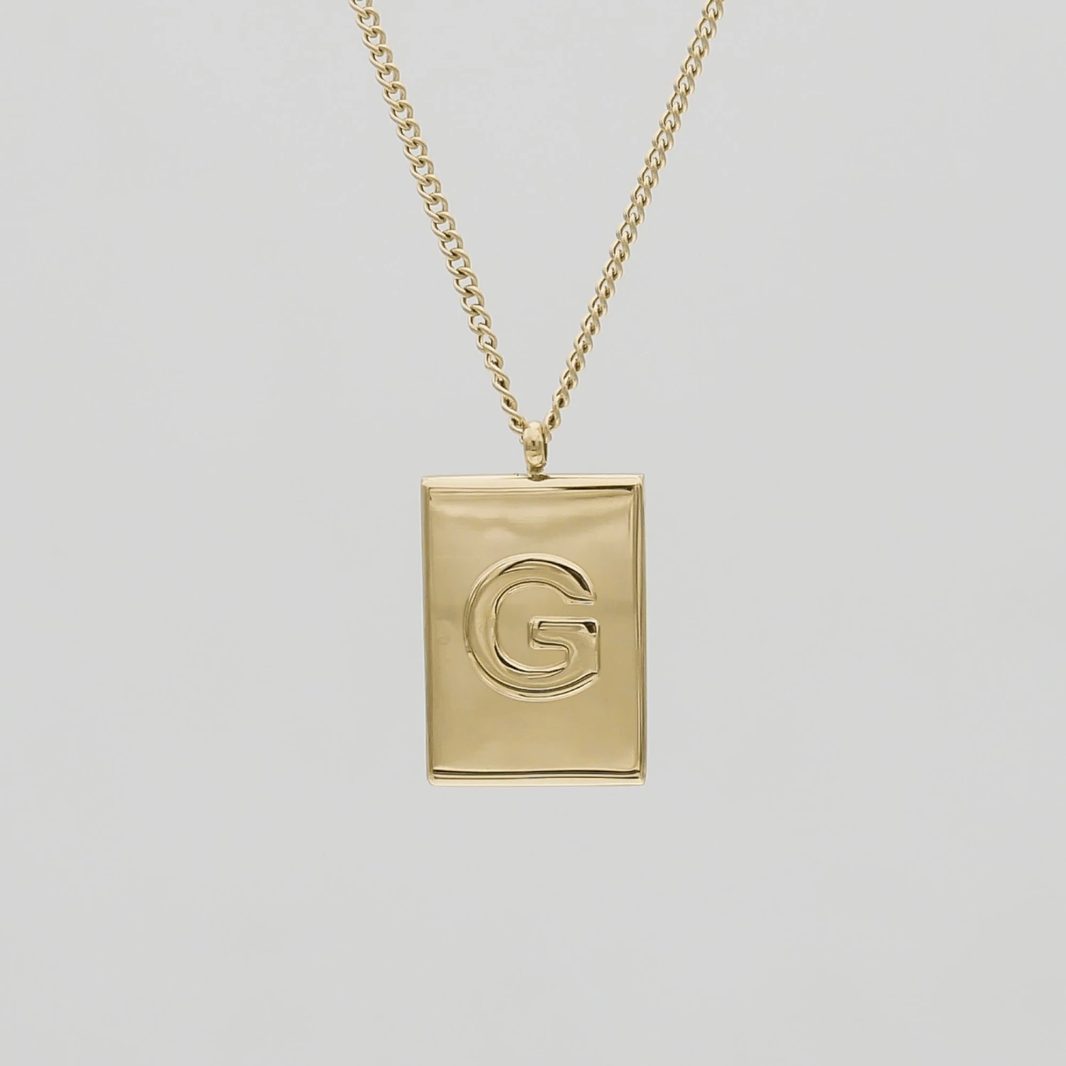 The necklace uses a traditional link chain that has miniature loops, keeping all the attention on the main interest, the tablet pendant. The pendant is attached to the chain with a rounded metal bail which attaches directly to the tablet. The tablet is made from 18K gold plated stainless steel and is rectangular in shape. It is very thin in-depth, only 2mm, and has a slightly bevelled edge. The initial letter you have chosen is embossed in the centre of the tablet, with the surface of the letter slightly raised. The initial is featured as a capitalised letter with a block font style making the initial easy to read.