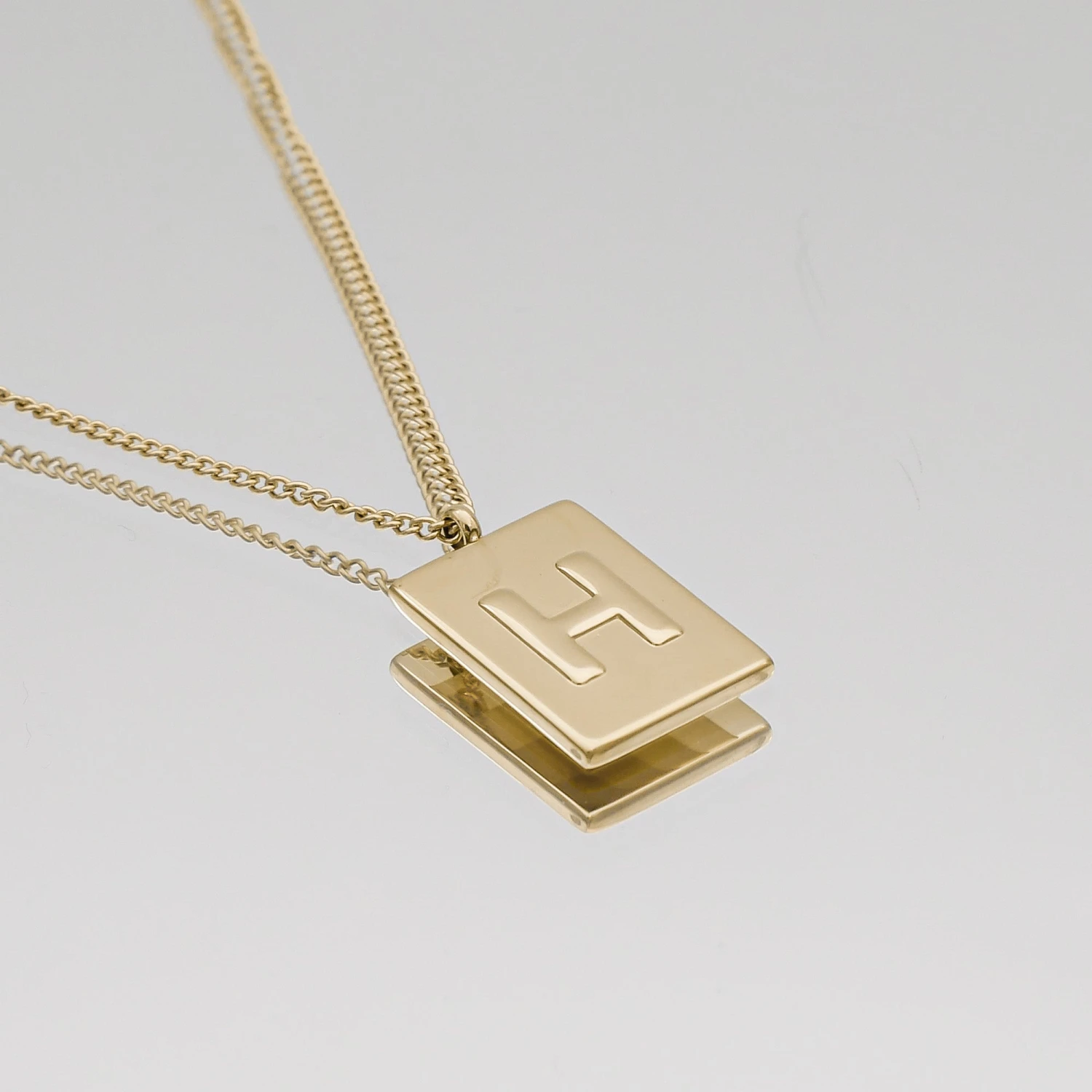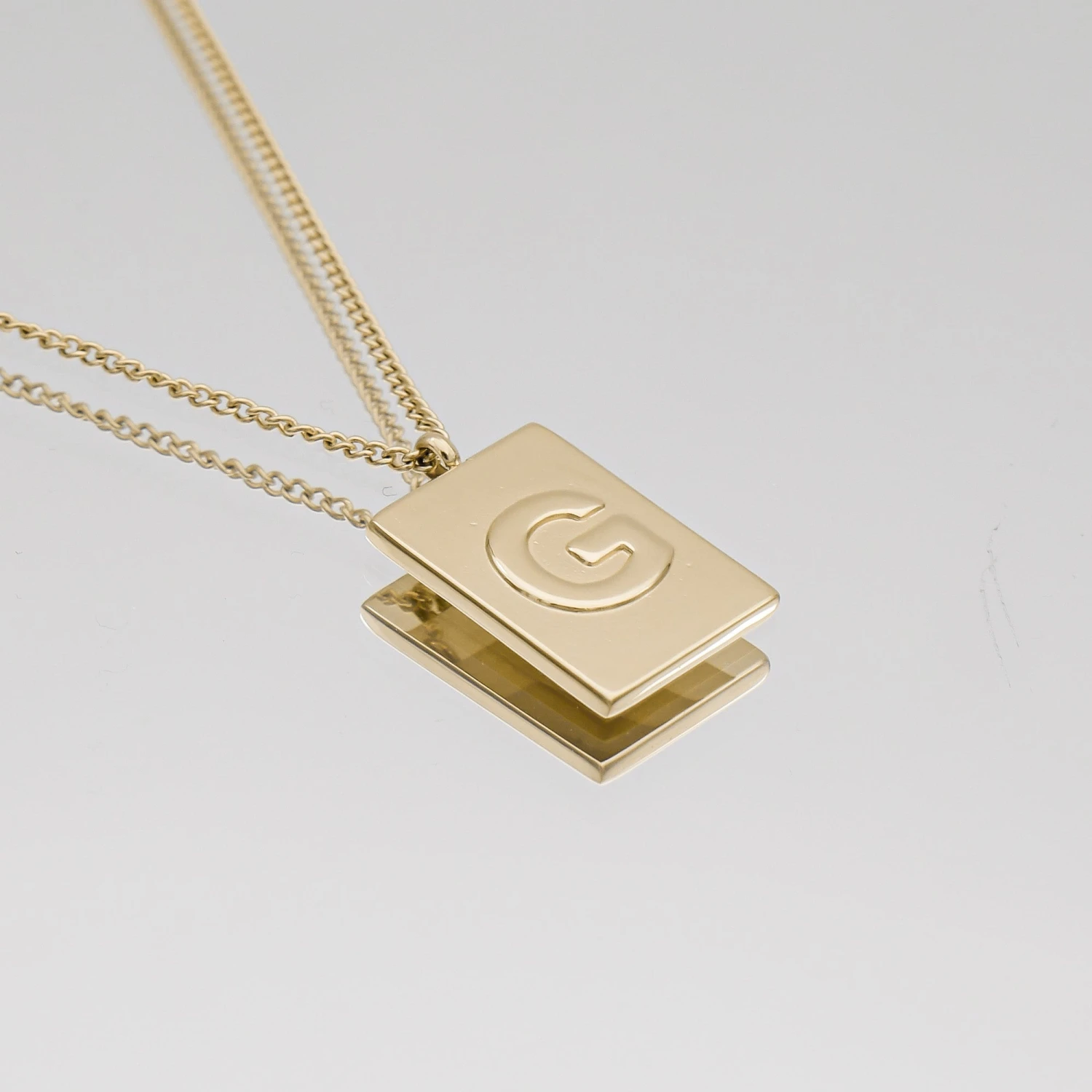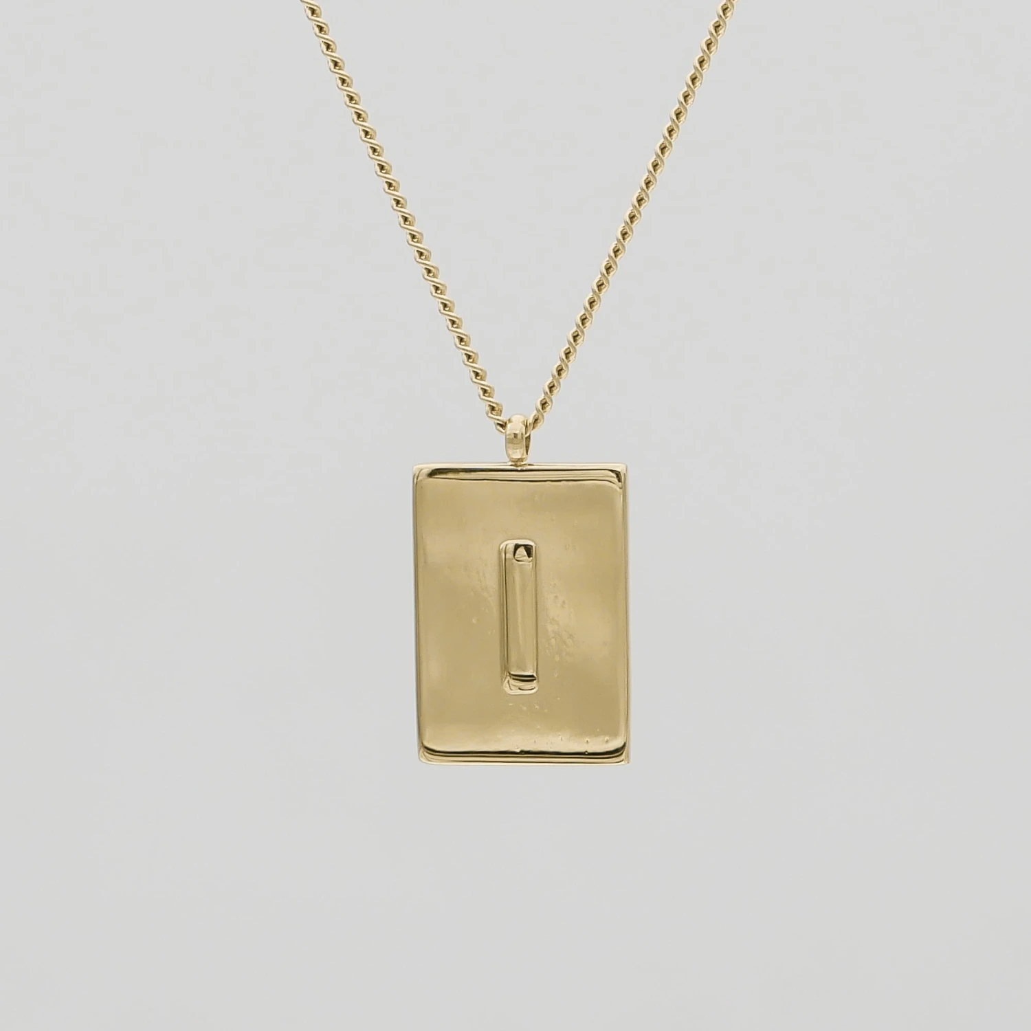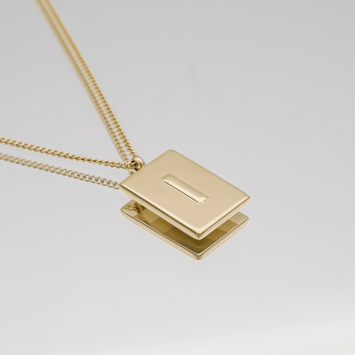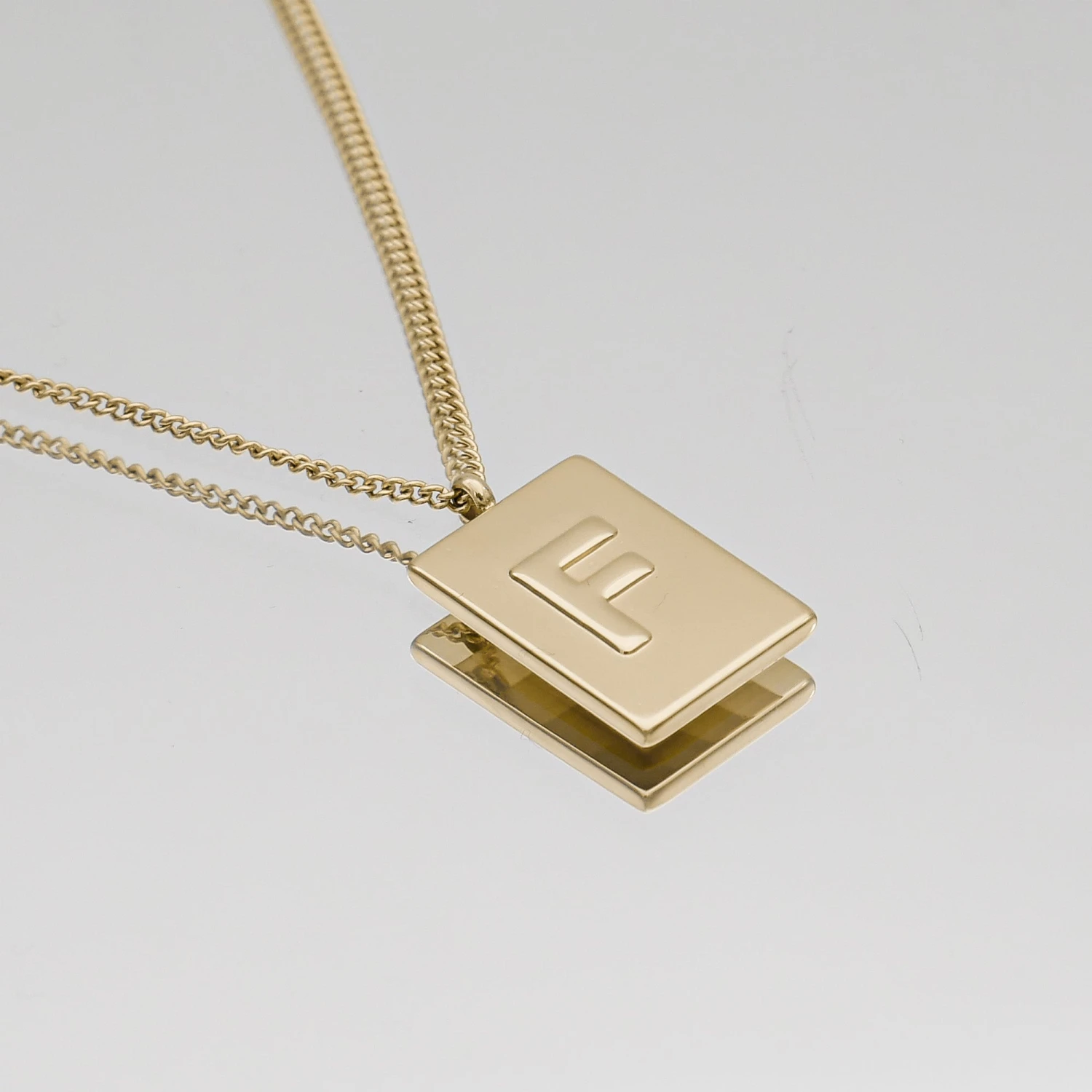 The necklace uses a traditional link chain that has miniature loops, keeping all the attention on the main interest, the tablet pendant. The pendant is attached to the chain with a rounded metal bail which attaches directly to the tablet. The tablet is made from 18K gold plated stainless steel and is rectangular in shape. It is very thin in-depth, only 2mm, and has a slightly bevelled edge. The initial letter you have chosen is embossed in the centre of the tablet, with the surface of the letter slightly raised. The initial is featured as a capitalised letter with a block font style making the initial easy to read.