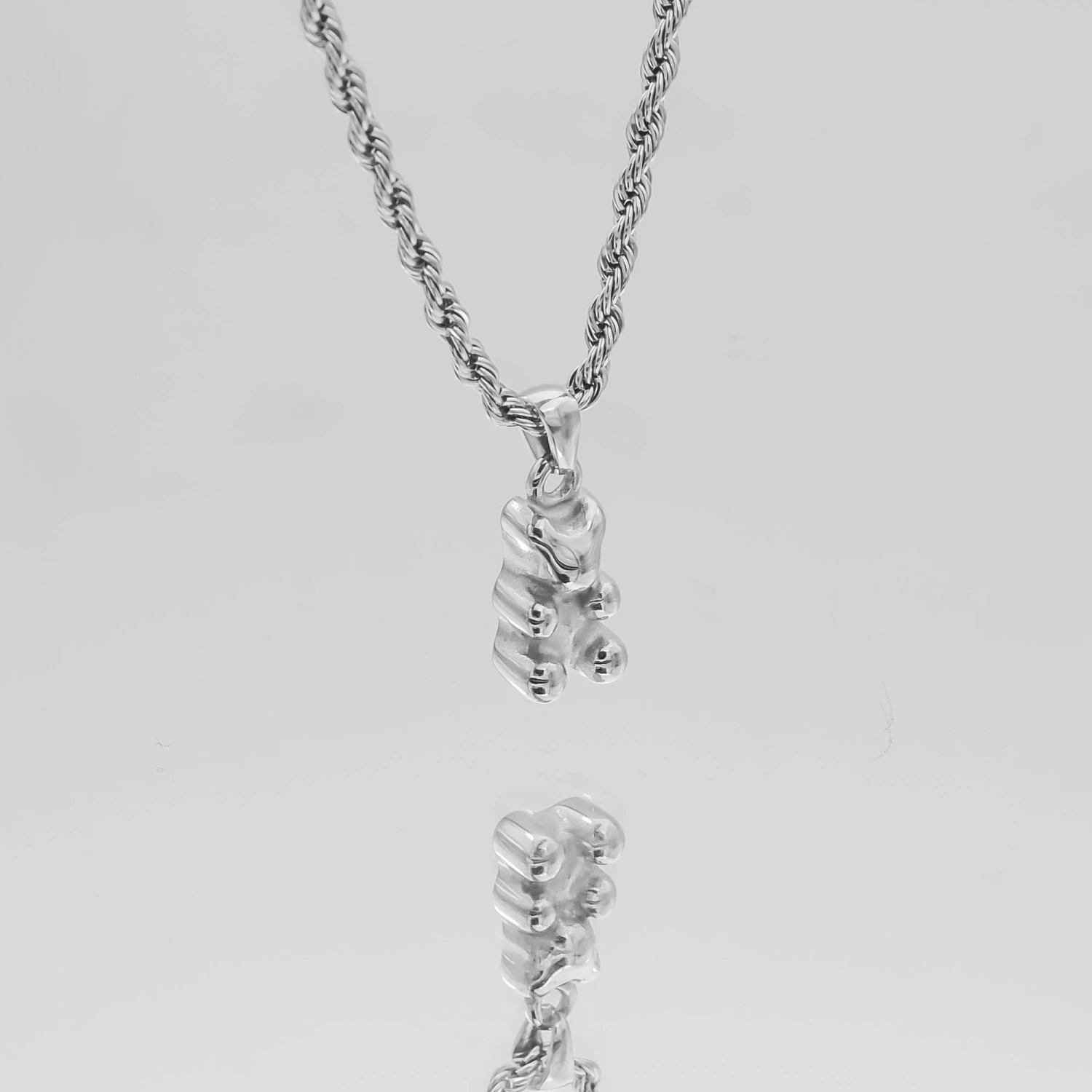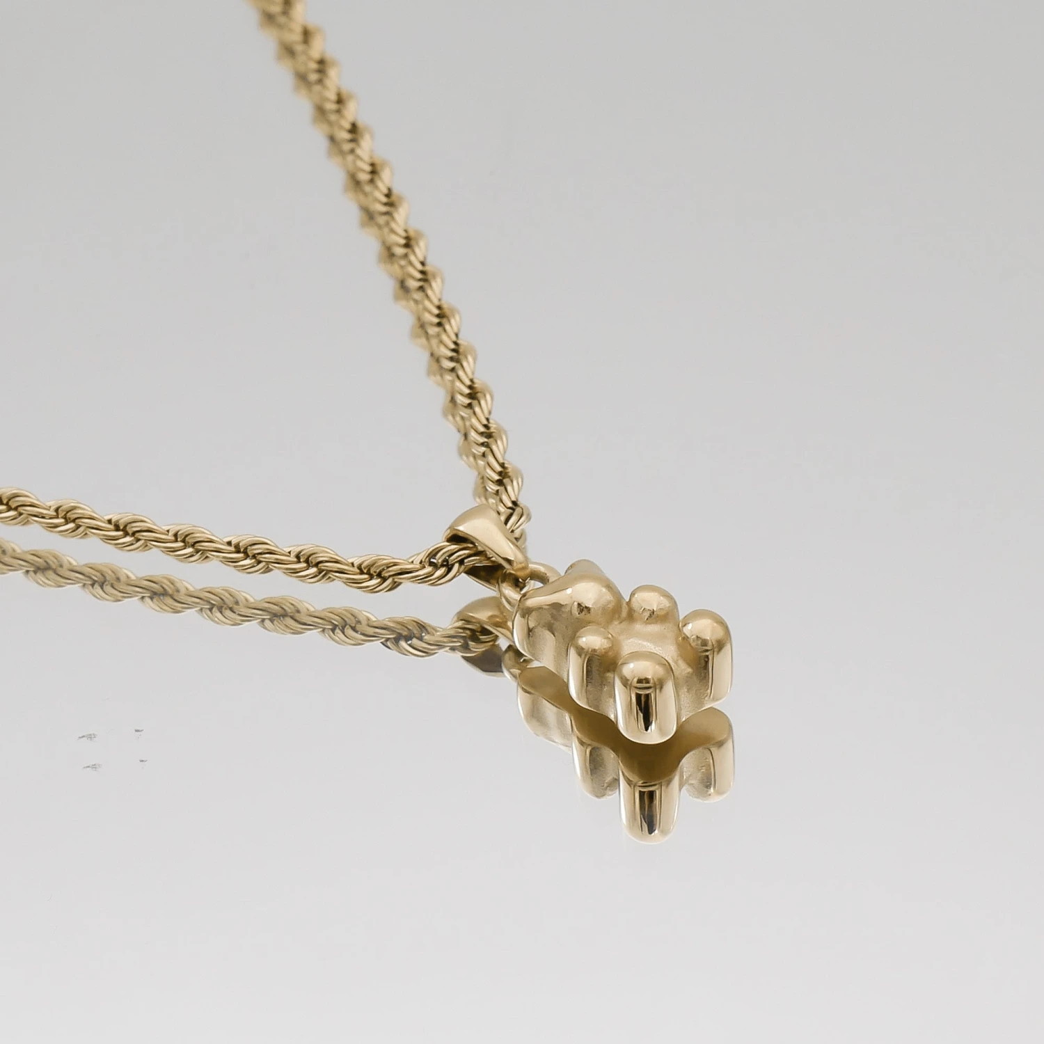 The teddy bear silhouette pendant is suspended on a stunning rope chain that adds texture and movement to the necklace. The metal bail hangs in the centre of the chain and attaches to the pendant with a small loop at the top of the pendant. The bear shaped pendant is simply polished and the necklace is fastened with a classic trigger clasp, making it super easy and comfortable to wear. Layer with your favourite choker or wear it alone as a statement piece.
