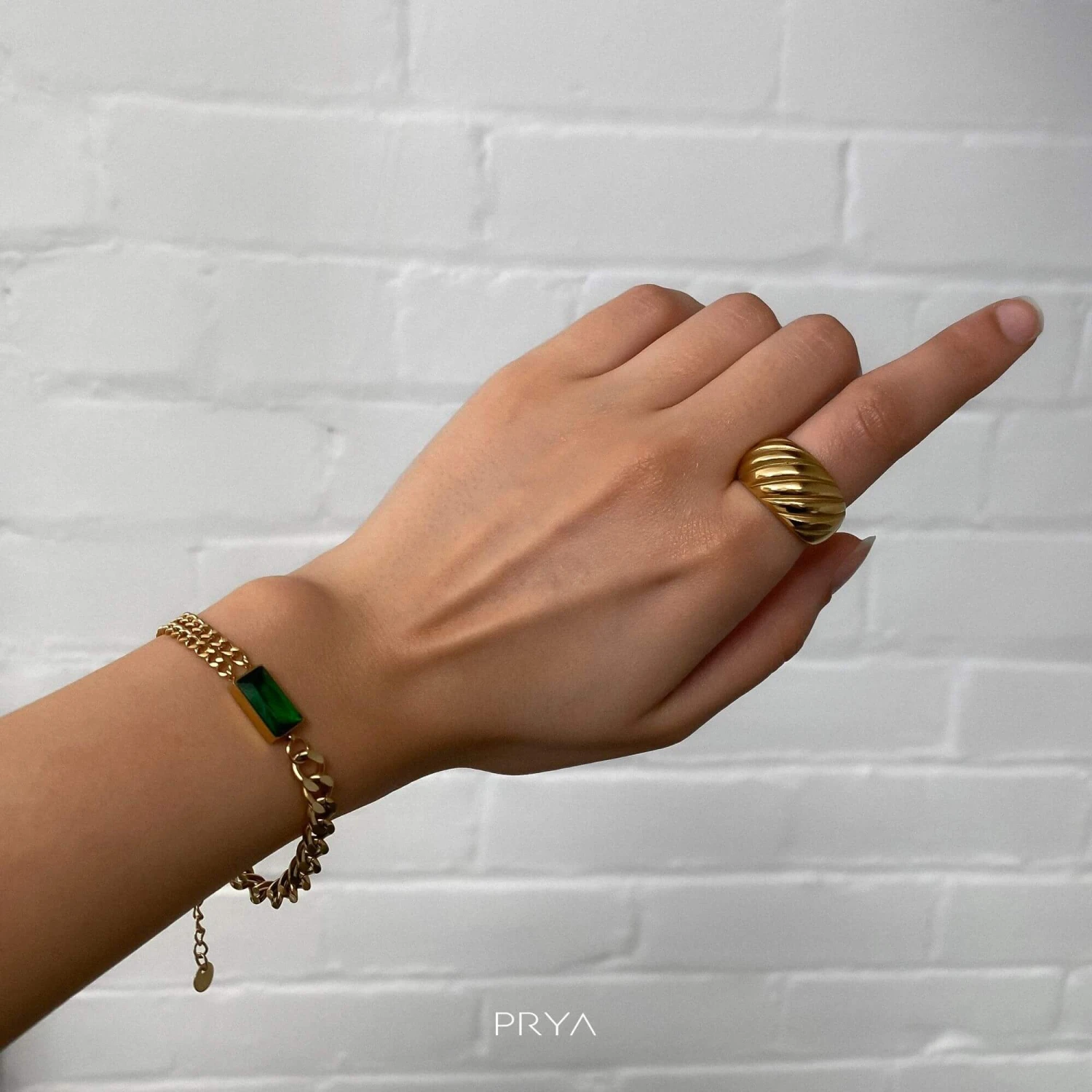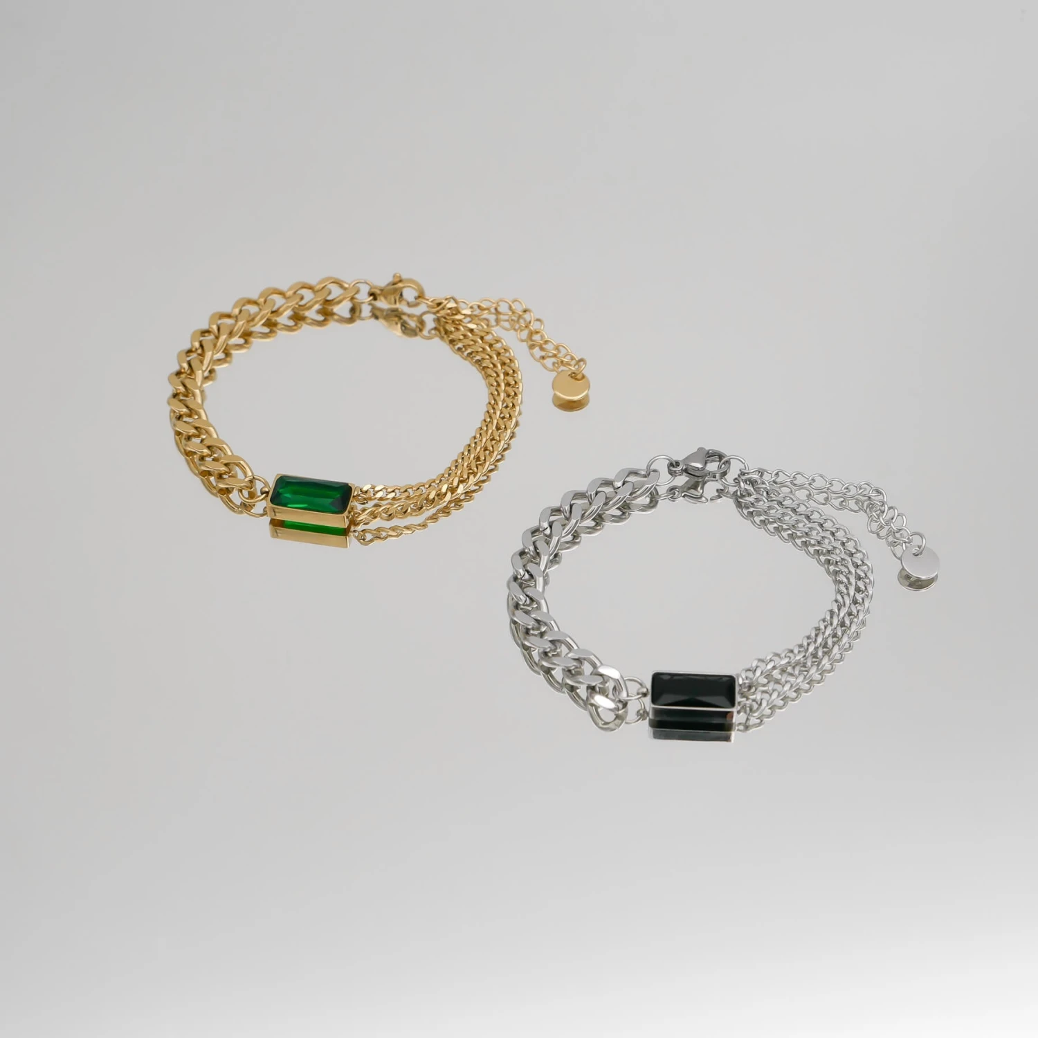 This Callie bracelet is an effortless design that balances minimalism and statement dressing. Featuring a captivating emerald stone suspended between contrasting cuban chain designs. One side of the bracelet features two separated cuban chains and on the other side, a thick cuban link chain. This distinctive gem works perfectly as a solo statement piece or stack with a couple of other bracelets. Match with our Callie necklace for a captivating look that no one can resist admiring.