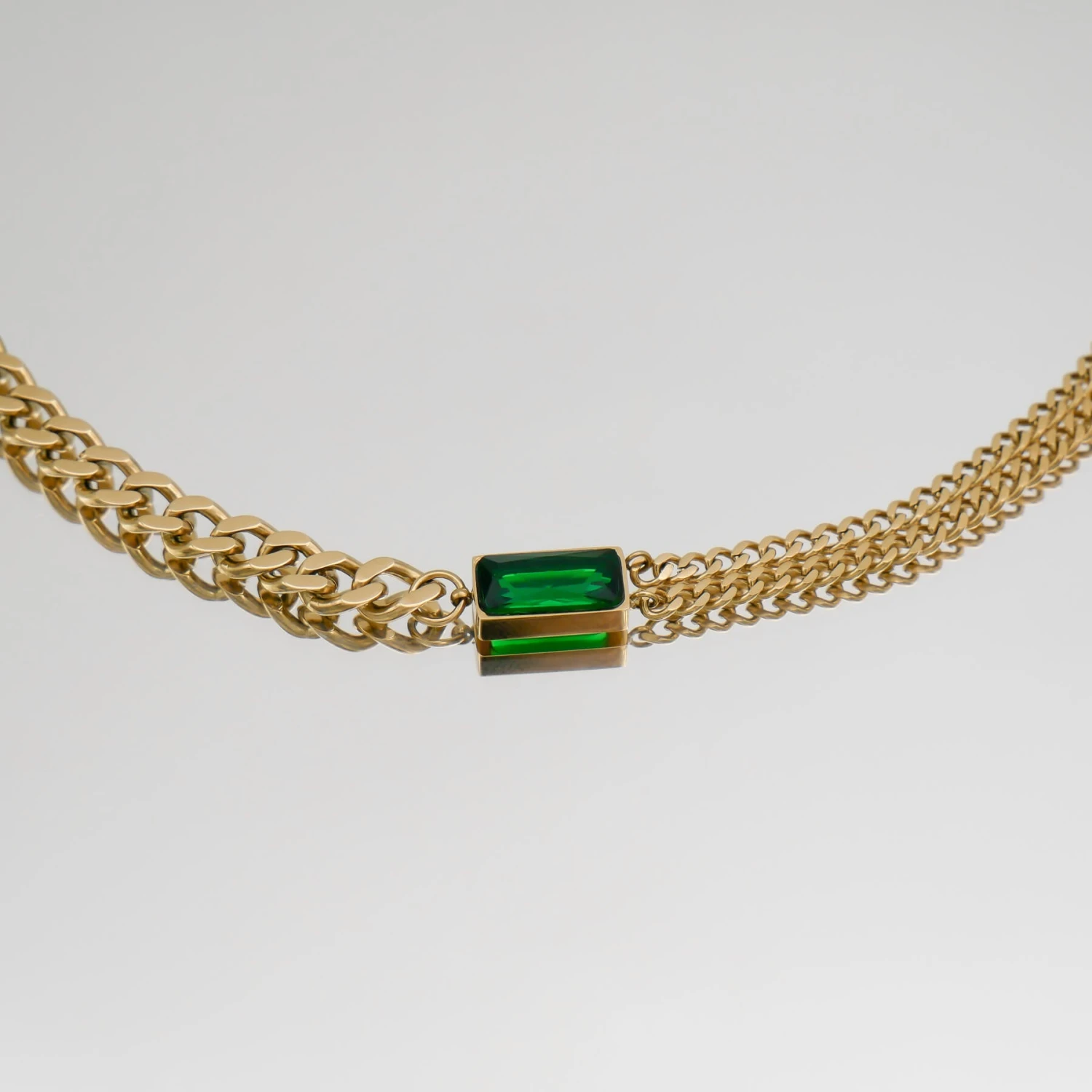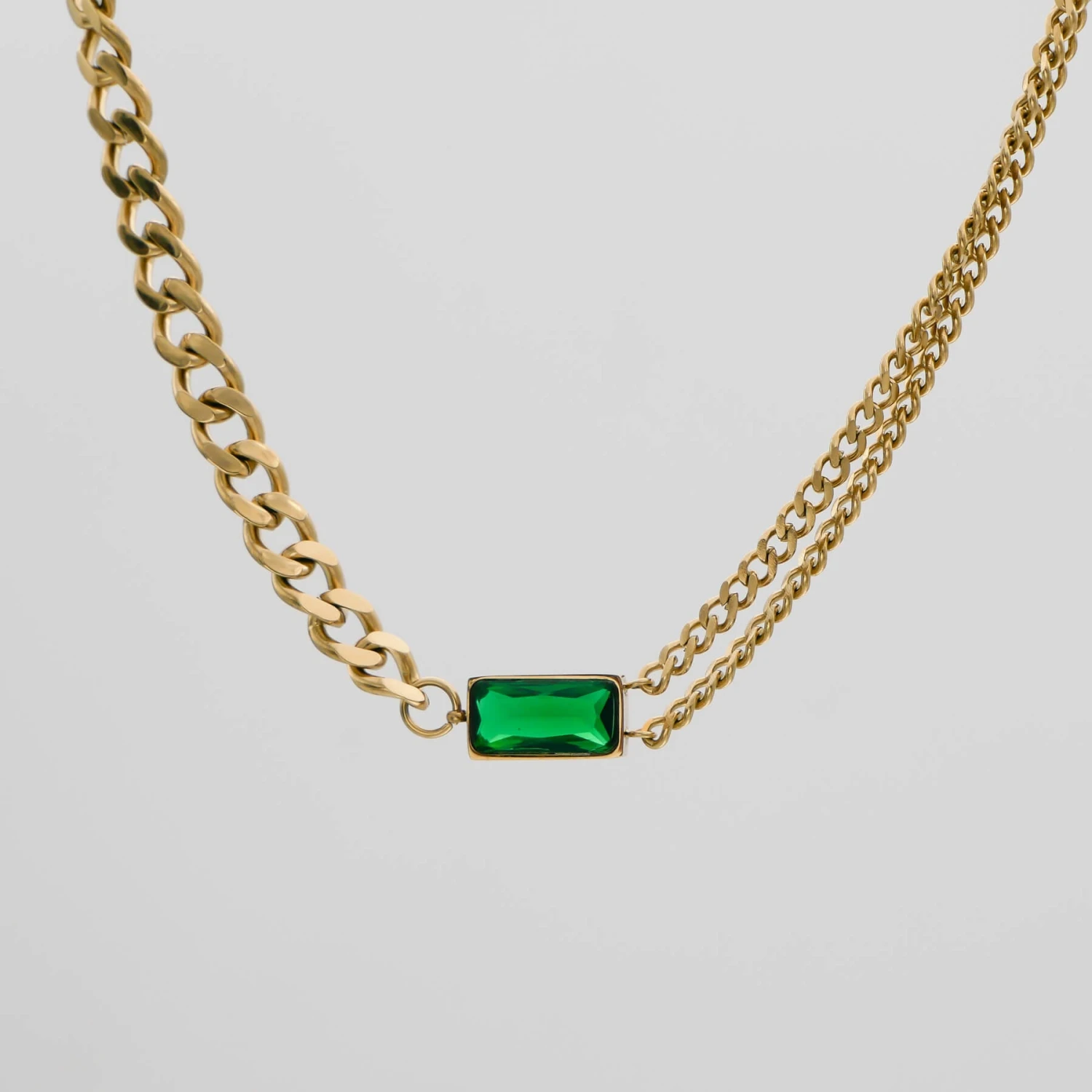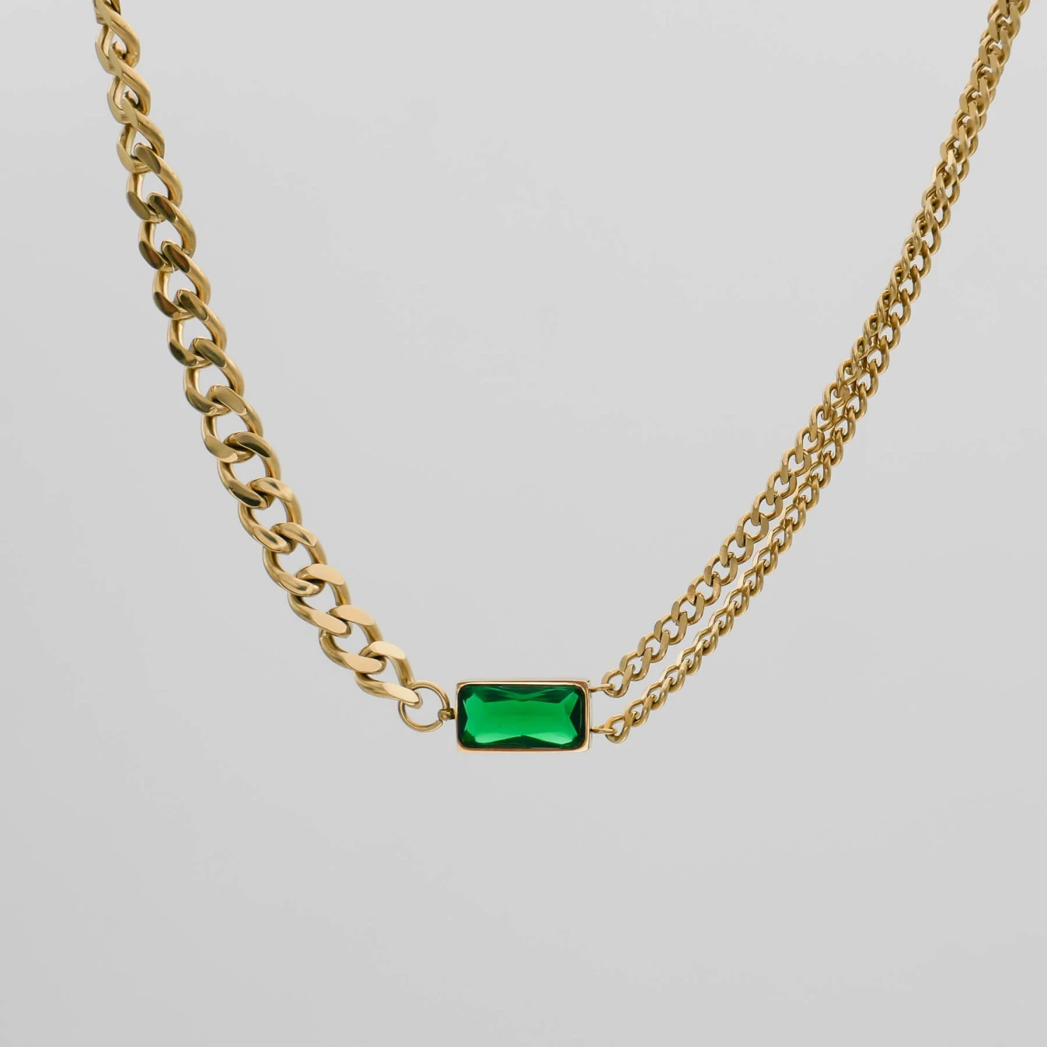 This Callie necklace is an effortless design that balances minimalism and statement dressing. Featuring a captivating emerald stone suspended between contrasting cuban chain designs. One side of the necklace features two separated cuban chains and on the other side, a thick cuban link chain. This distinctive gem works perfectly as a solo statement piece or layer with a couple of other necklaces. Match with our Callie bracelet for a captivating look that no one can resist admiring.