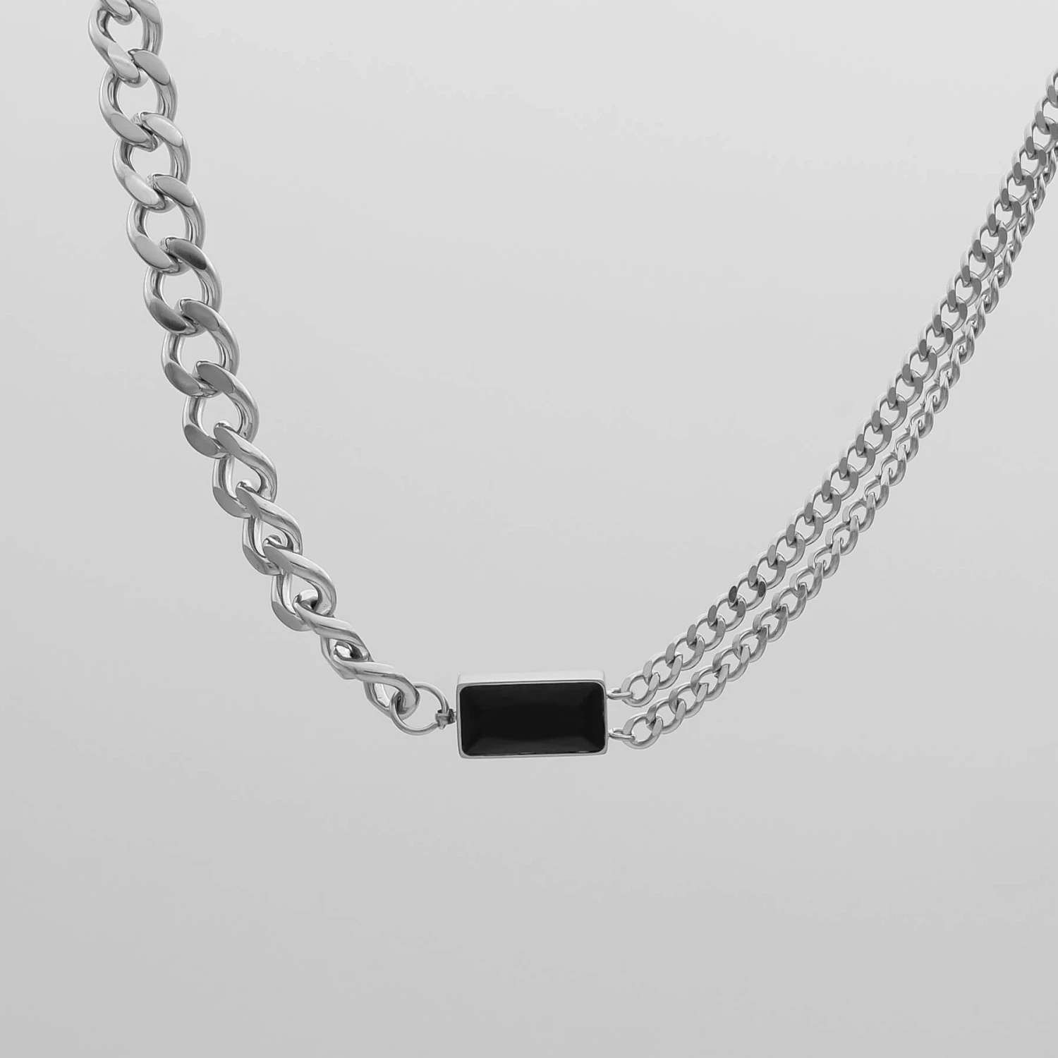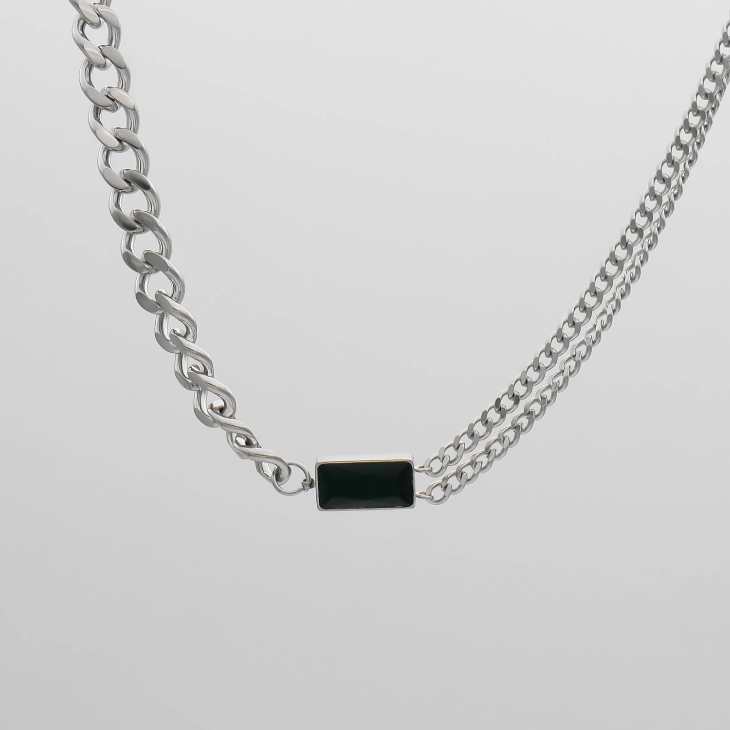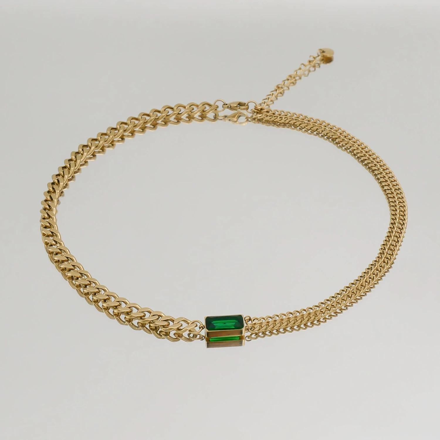 This Callie necklace is an effortless design that balances minimalism and statement dressing. Featuring a captivating emerald stone suspended between contrasting cuban chain designs. One side of the necklace features two separated cuban chains and on the other side, a thick cuban link chain. This distinctive gem works perfectly as a solo statement piece or layer with a couple of other necklaces. Match with our Callie bracelet for a captivating look that no one can resist admiring.