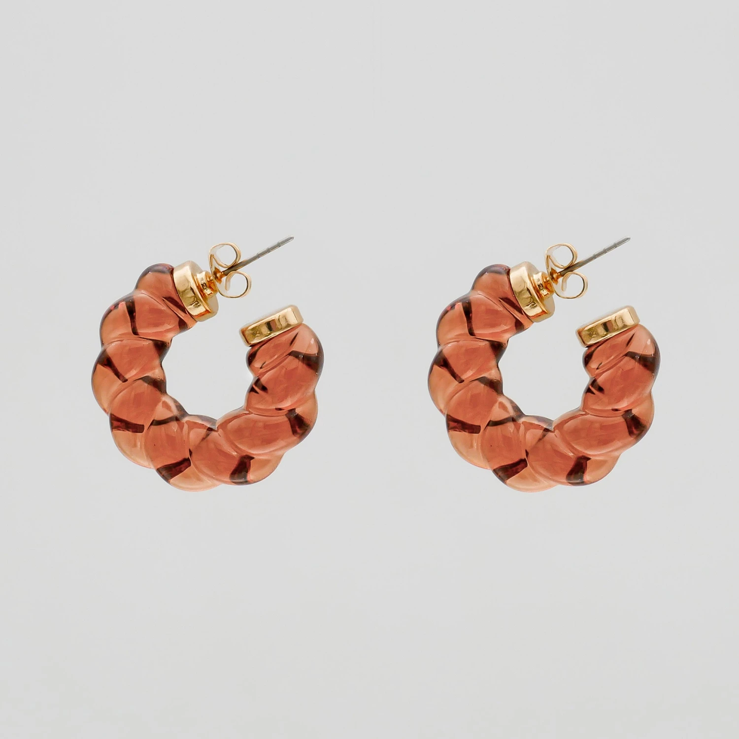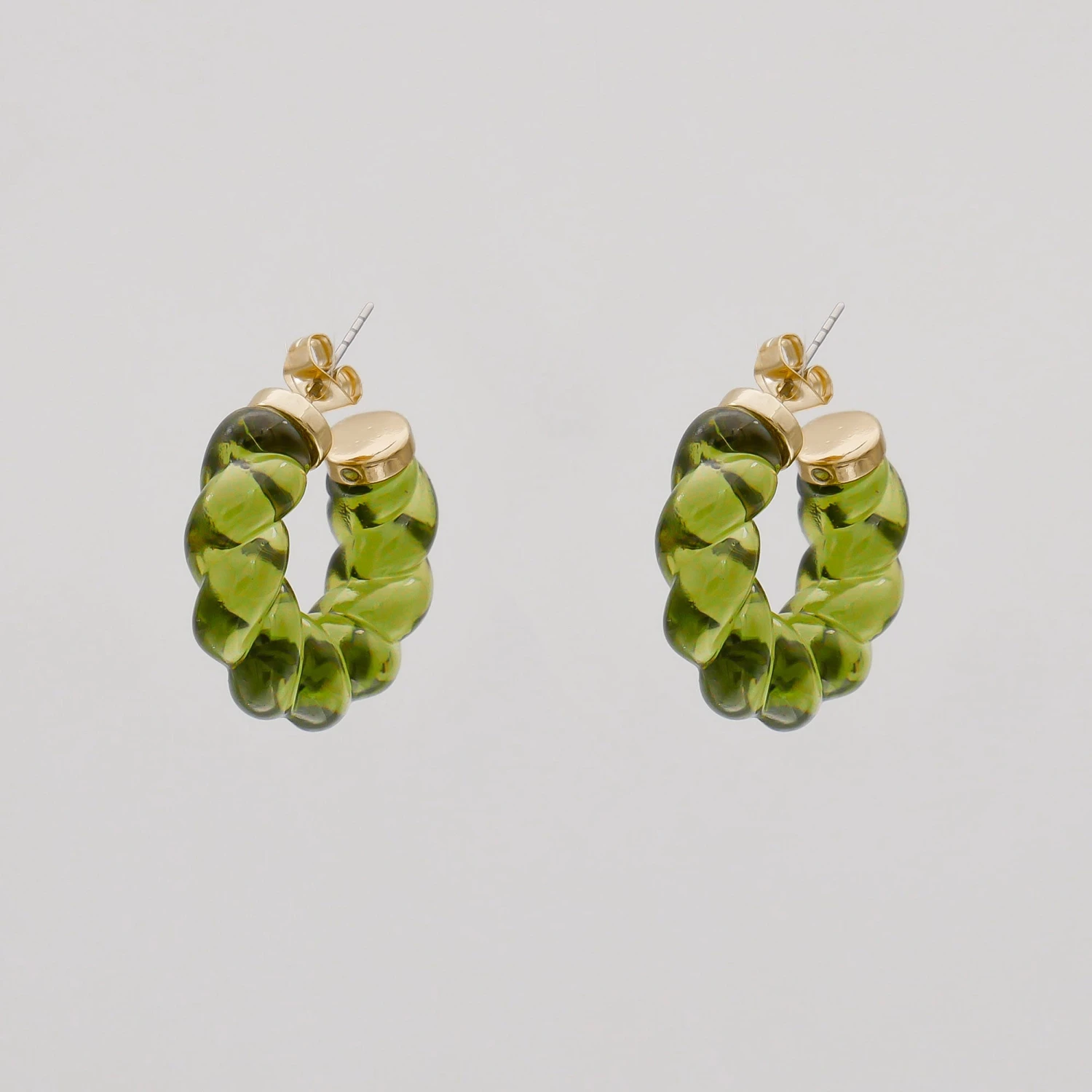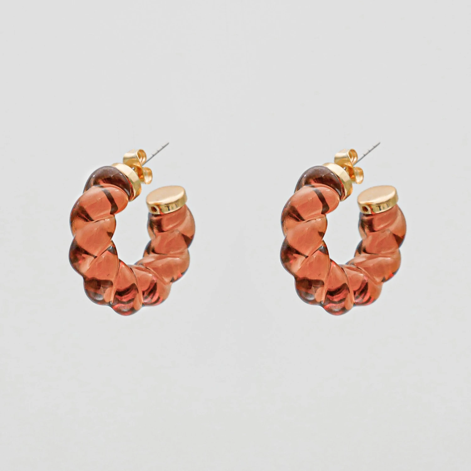 Our Candi hoop earrings puts a fun spin on the classic hoop style. Featuring a twisted jelly like design, curving around the lobe for a fun statement look. This piece is artistic, beautifully crafted and exudes elegance.