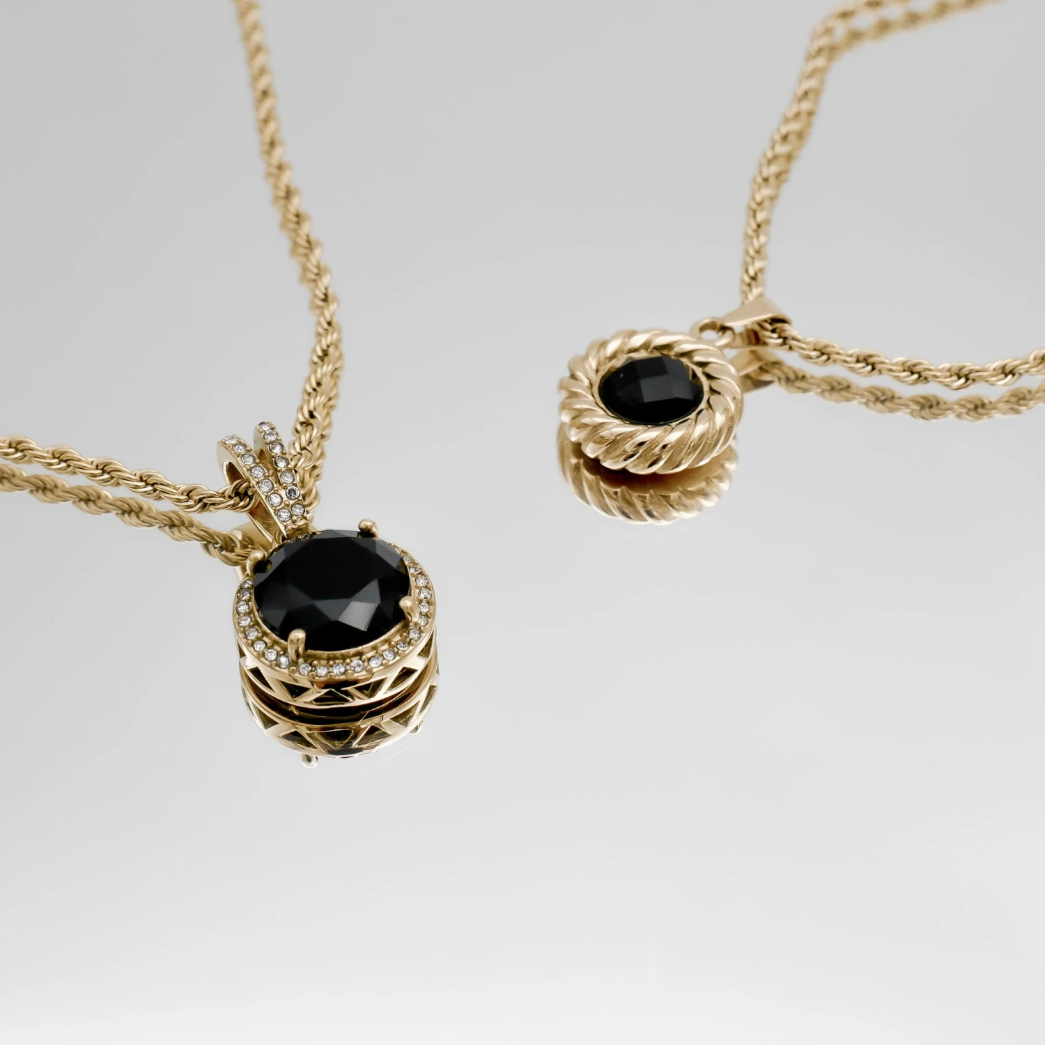 Our Clarissa Onyx Necklace is a vintage-inspired gemstone piece that features a rounded black emerald cut stone, surrounded by gems and supported by a gorgeous rope chain. This piece is modern, beautifully crafted and exudes elegance.