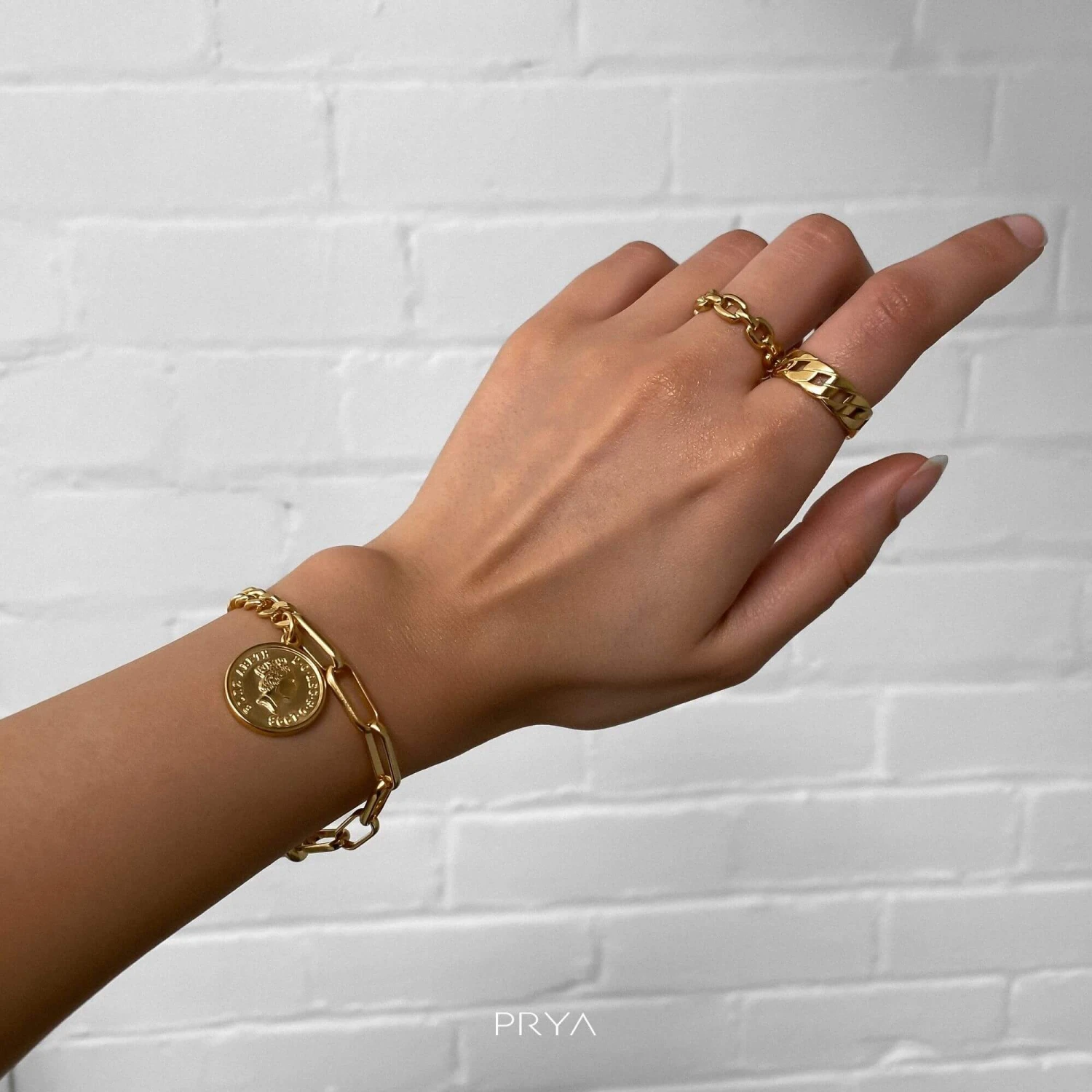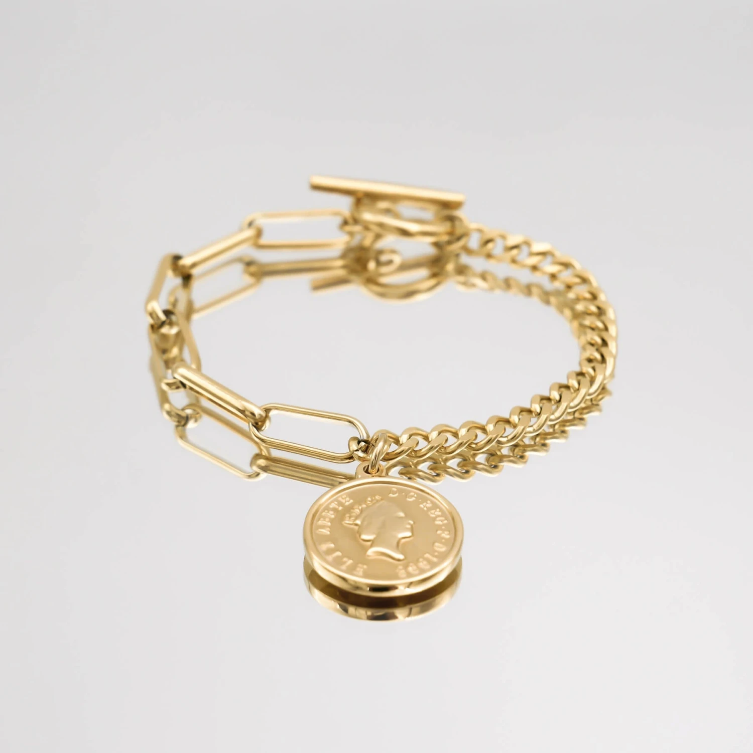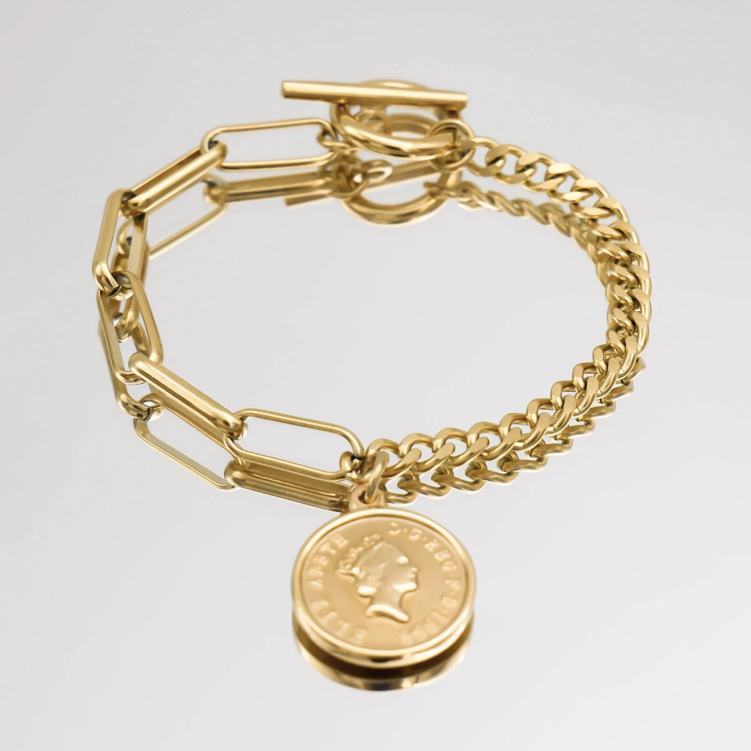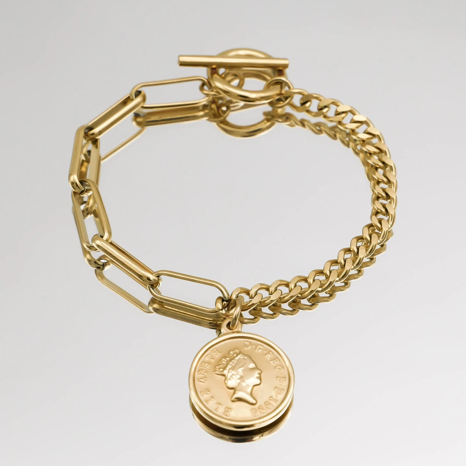 Inspired by the British coins with a stylish, modern twist. This Coin link bracelet exudes elegance and prosperity adding character with its contrasting cuban and paper clip chain links and beautifully finished with a T-bar closure.