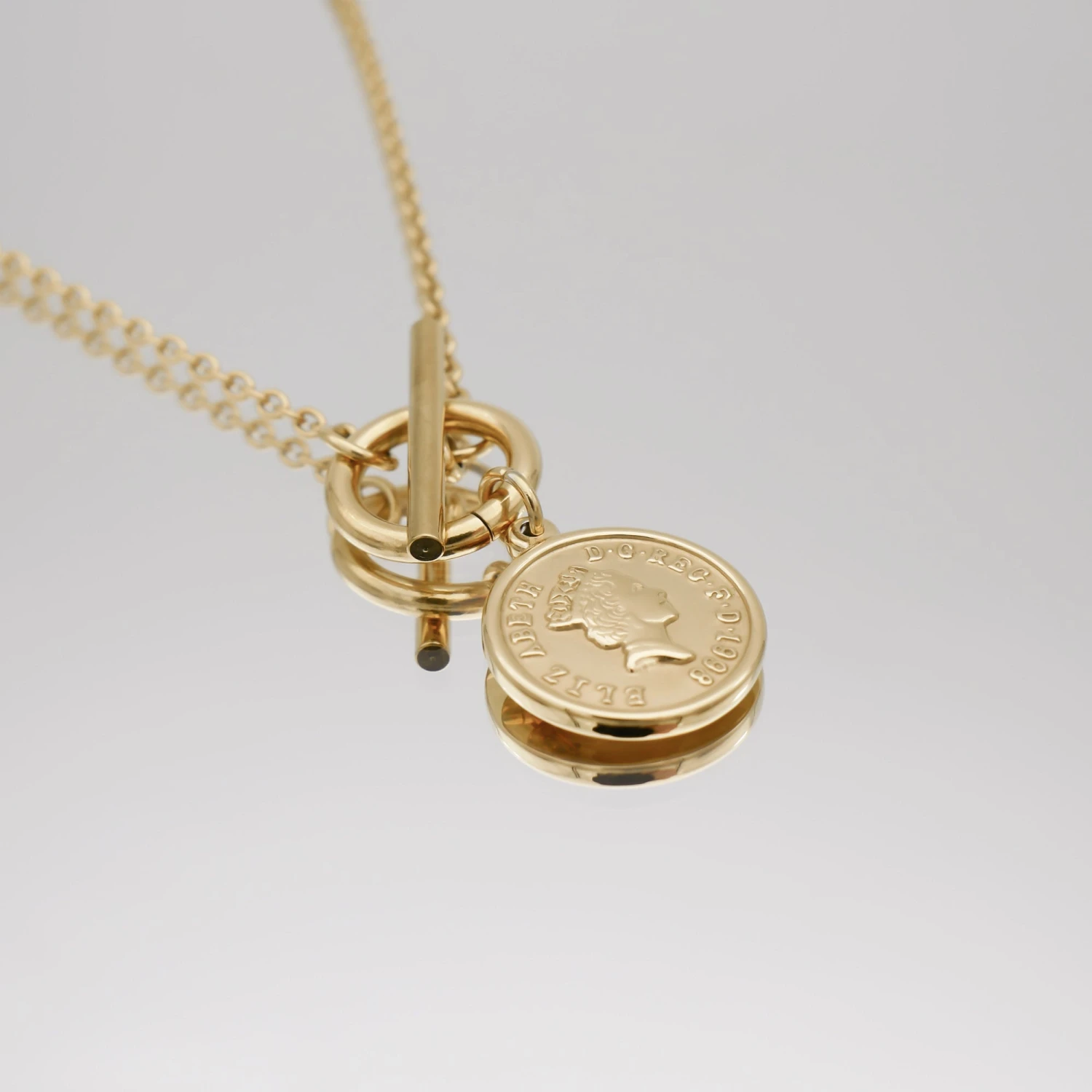 Our Gold Coin Pendant Necklace, inspired by British coins with a modern twist. This elegant gold necklace features a detailed coin pendant on a classic Cuban chain with a stylish T-bar closure. Perfect for any occasion, it adds character and sophistication to any outfit.