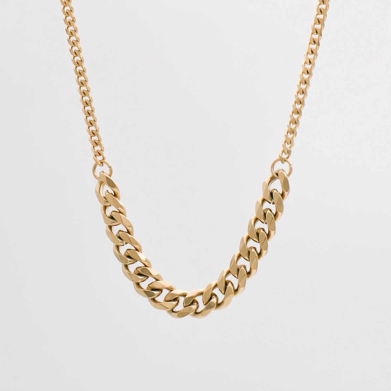 This connie cuban necklace is an effortless design that balances minimalism and statement dressing. Featuring a thin linked cuban chain, transforming to a thick link chain. This beautiful piece works perfectly, solo or layer with a couple of other necklaces for a captivating look that no one can resist admiring.