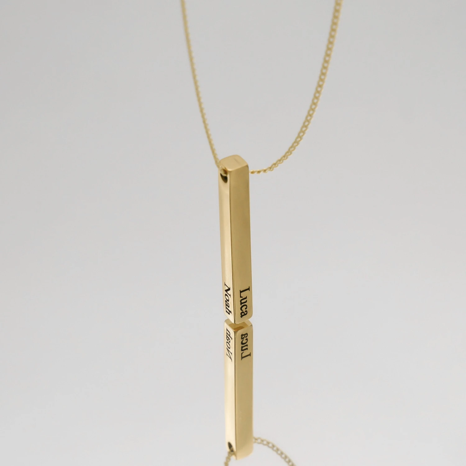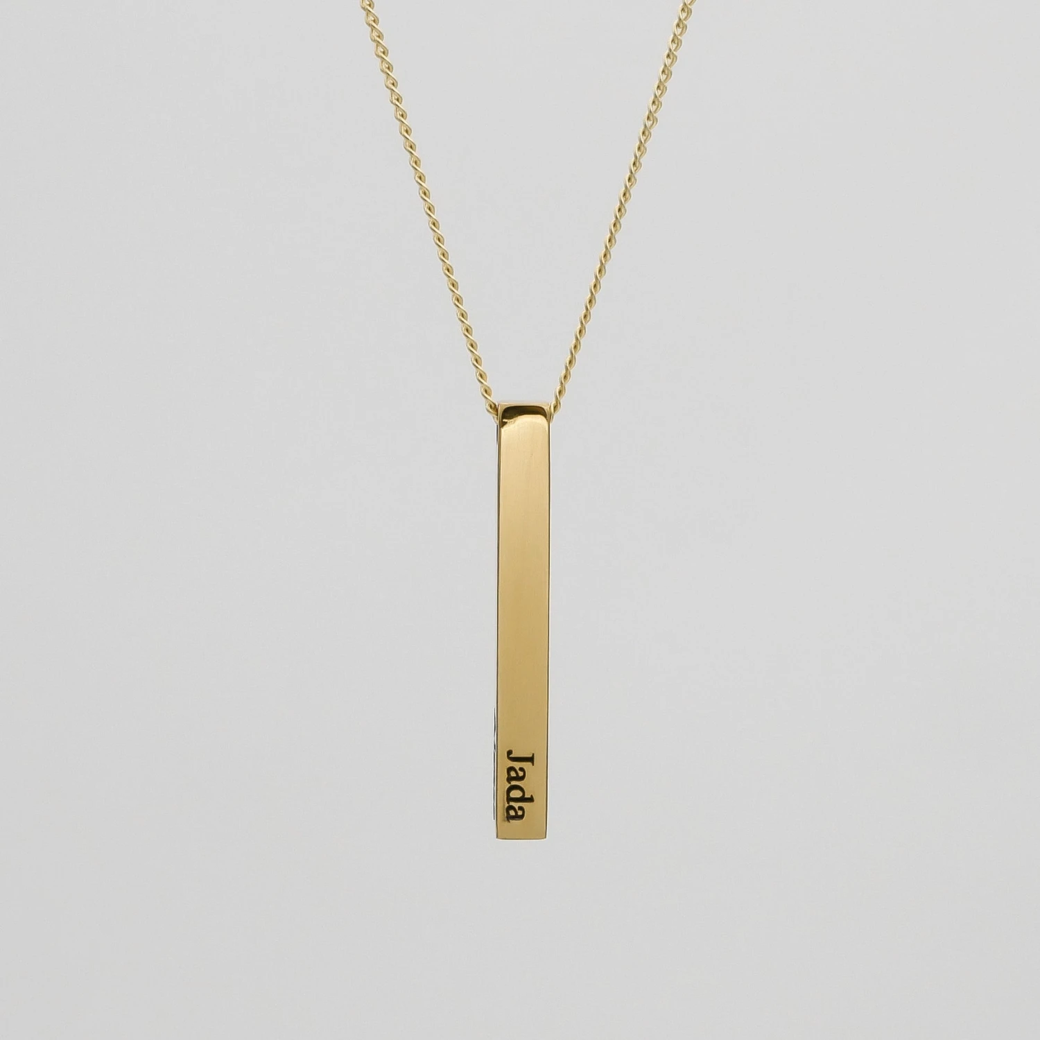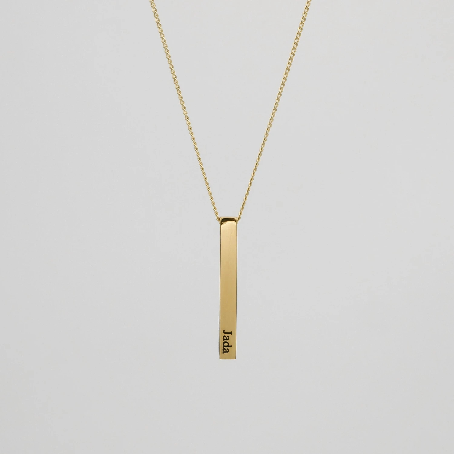 Make it personal with our custom bar necklace. Engrave a name, date or anything you like on up to four sides of the pendant. simple chose how many sides you would like engraving and then enter what you would like engraving. Crafted from 18k gold, 14K Rose Gold or Silver Plated stainless.