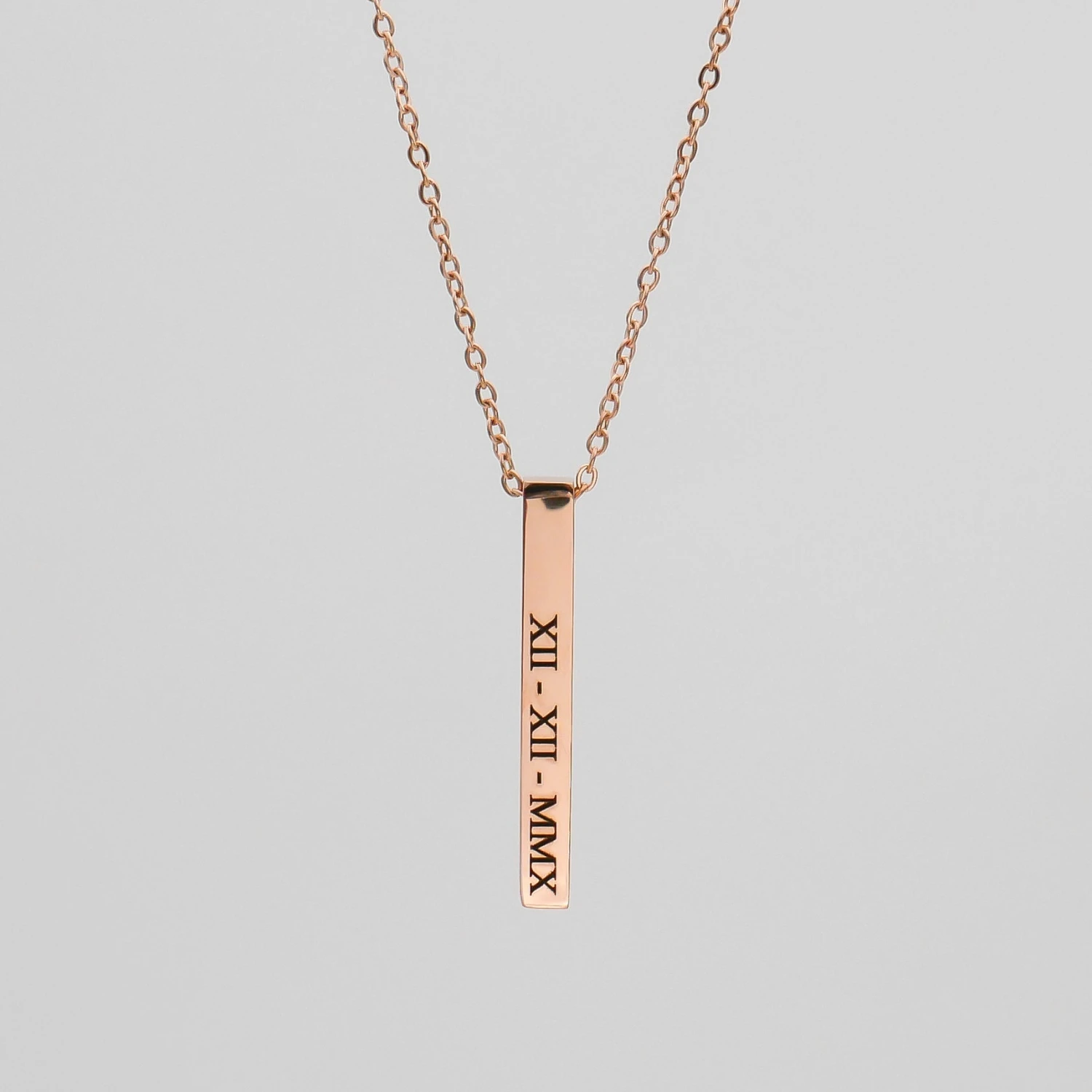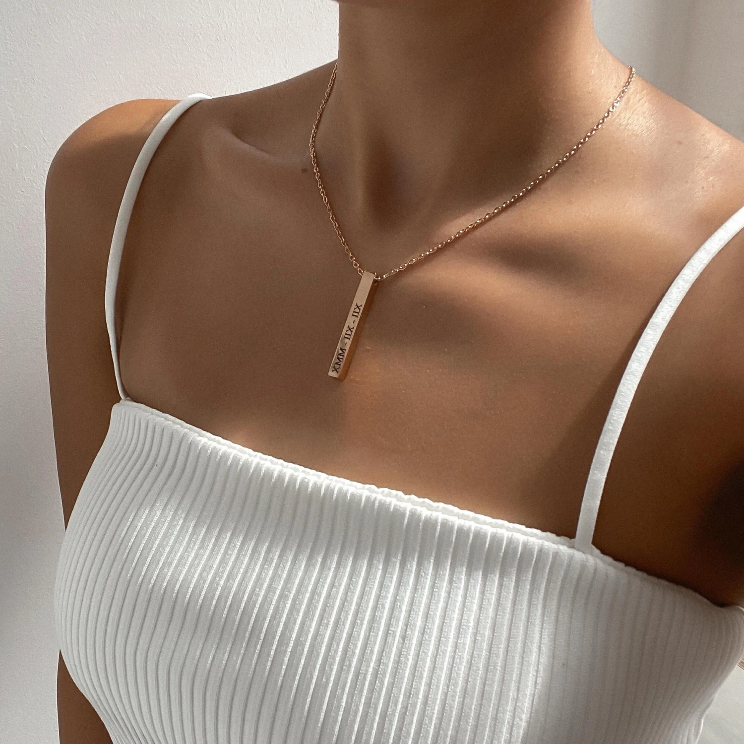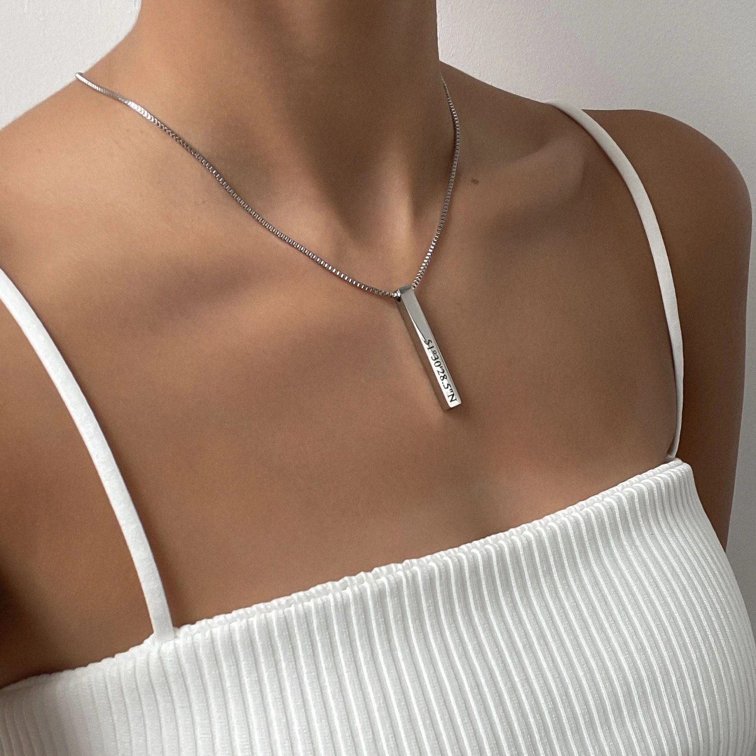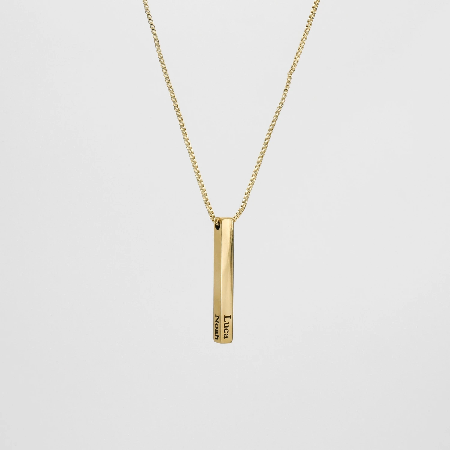 Make it personal with our custom bar necklace. Engrave a name, date or anything you like on up to four sides of the pendant. simple chose how many sides you would like engraving and then enter what you would like engraving. Crafted from 18k gold, 14K Rose Gold or Silver Plated stainless.