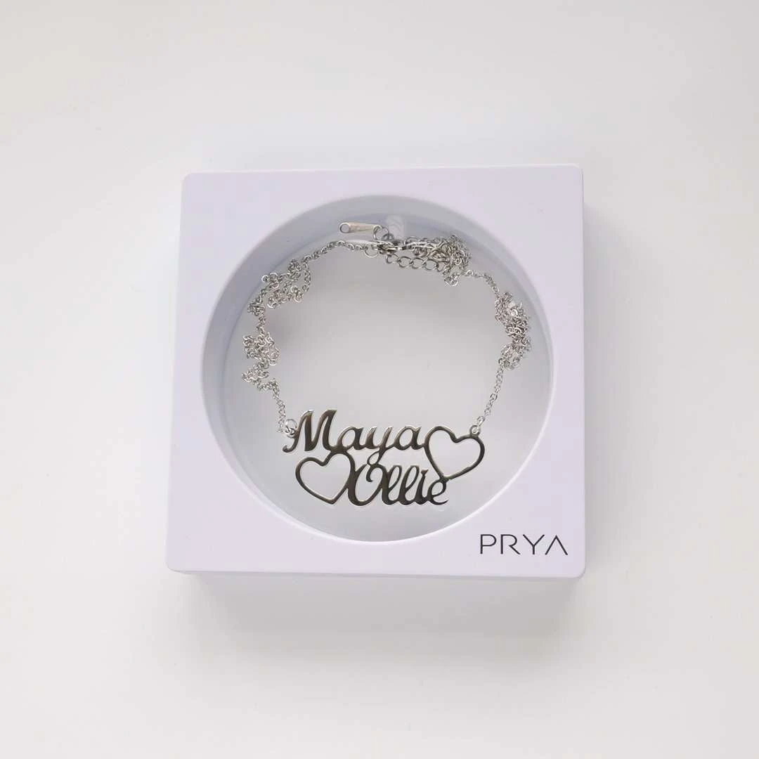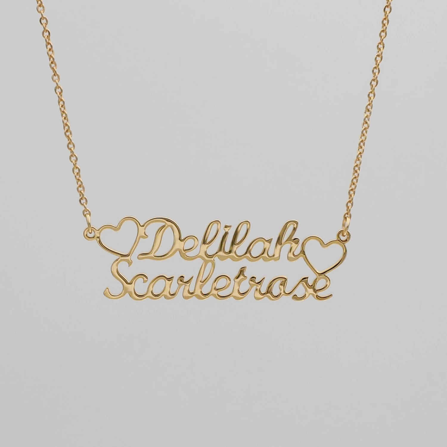 Personalise your look with our custom Double Name Heart Necklace. Choose from either 18k Gold plated or Silver plated Stainless steel.