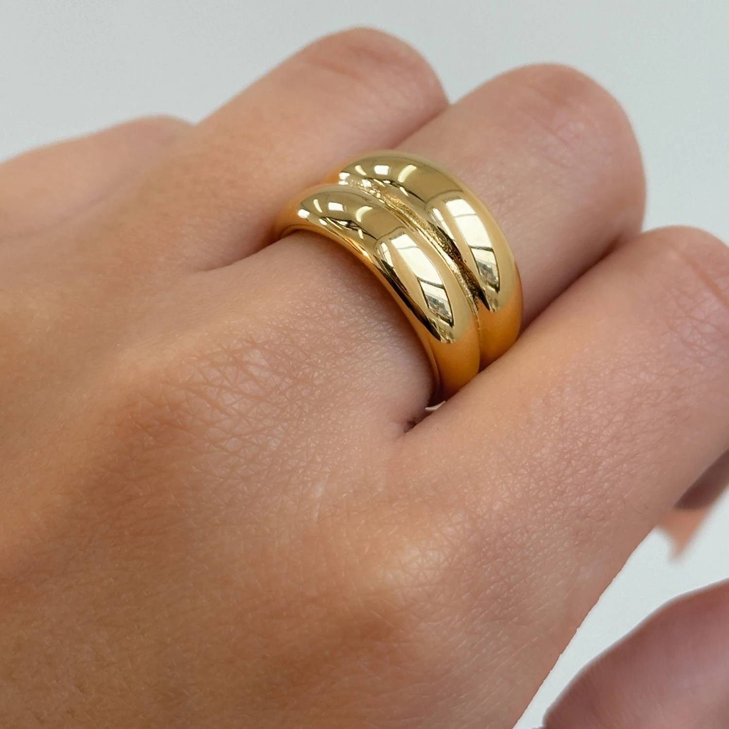 Dress your hands with our Eliana Double Band Statement Ring, a chunky piece featuring a bold, double band design. This eye-catching dome shaped ring is ideal for ring stacking, and adds a touch of modern sophistication to any look. Make a statement and pair it with your favourite delicate rings.