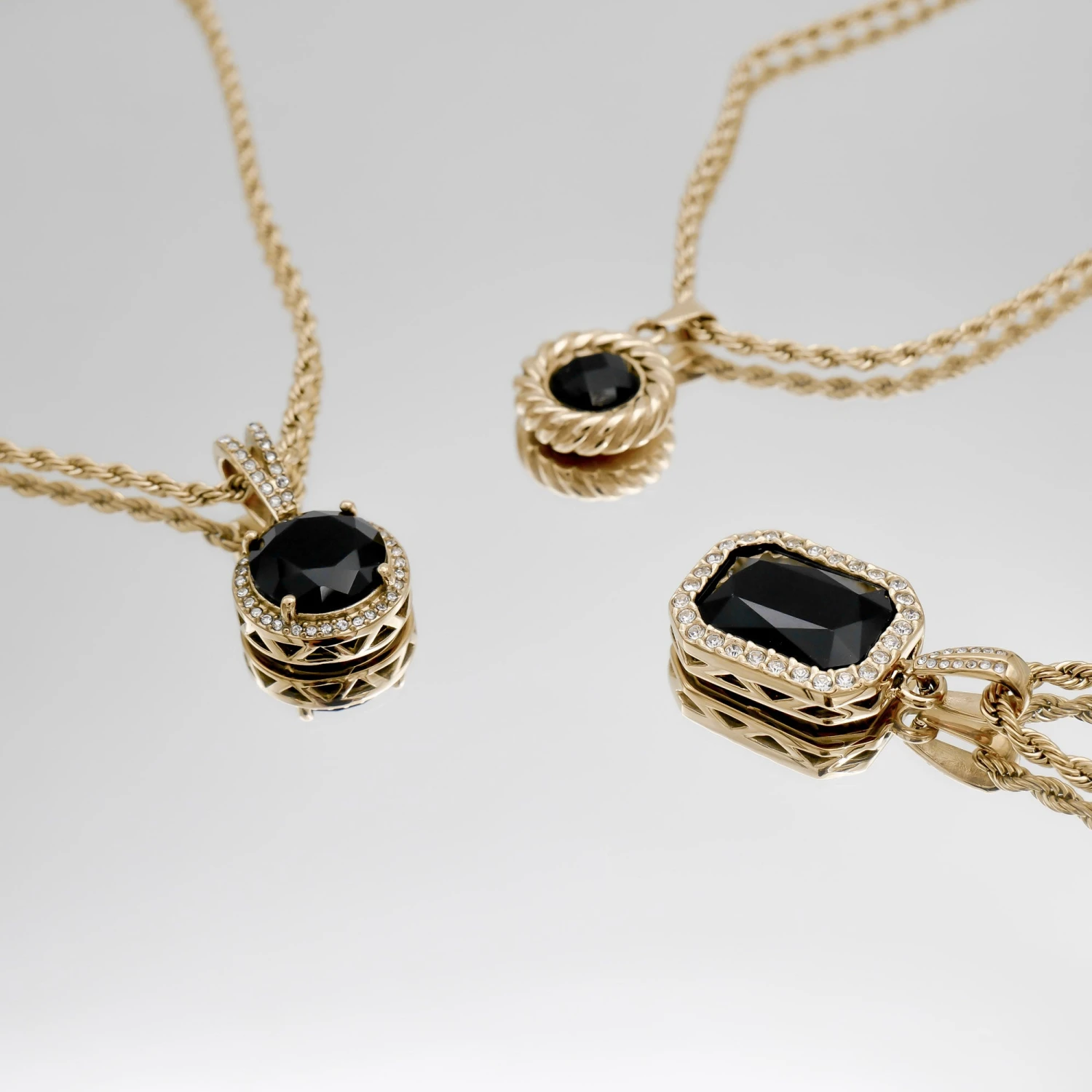 Our Esme Onyx Necklace is a vintage-inspired gemstone piece that features a rounded black emerald cut stone, surrounded by a gorgeous rounded plait and supported by a delicate rope chain. This piece is modern, beautifully crafted and exudes elegance. Also available in Pearl