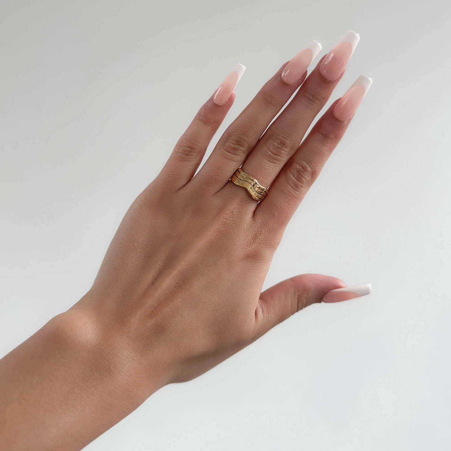 Our Esme Gold Ring is your go-to for bold, chunky style. This triple wave band ring makes a standout statement on its own or pairs perfectly in a ring stacking arrangement. An ode to days spent on the beach and among the rolling waves, its rich, textured design is ideal for elevating any outfit.