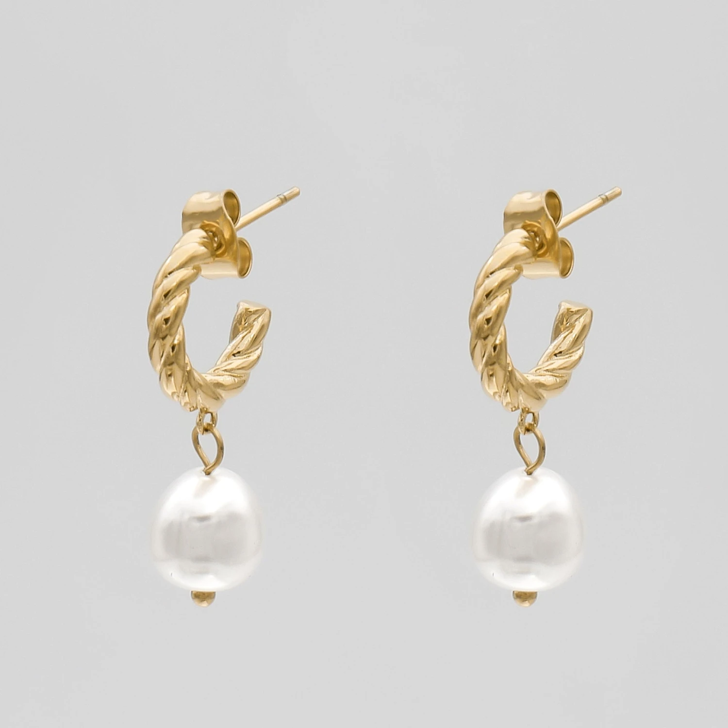 These shiny, silky iridescent Grace pearl earrings are your next jewellery obsession. The pearl stone is expertly and perfectly polished for maximum shine then carefully supported with a detailed 18k gold plated twisted hoop, creating a must have combination.