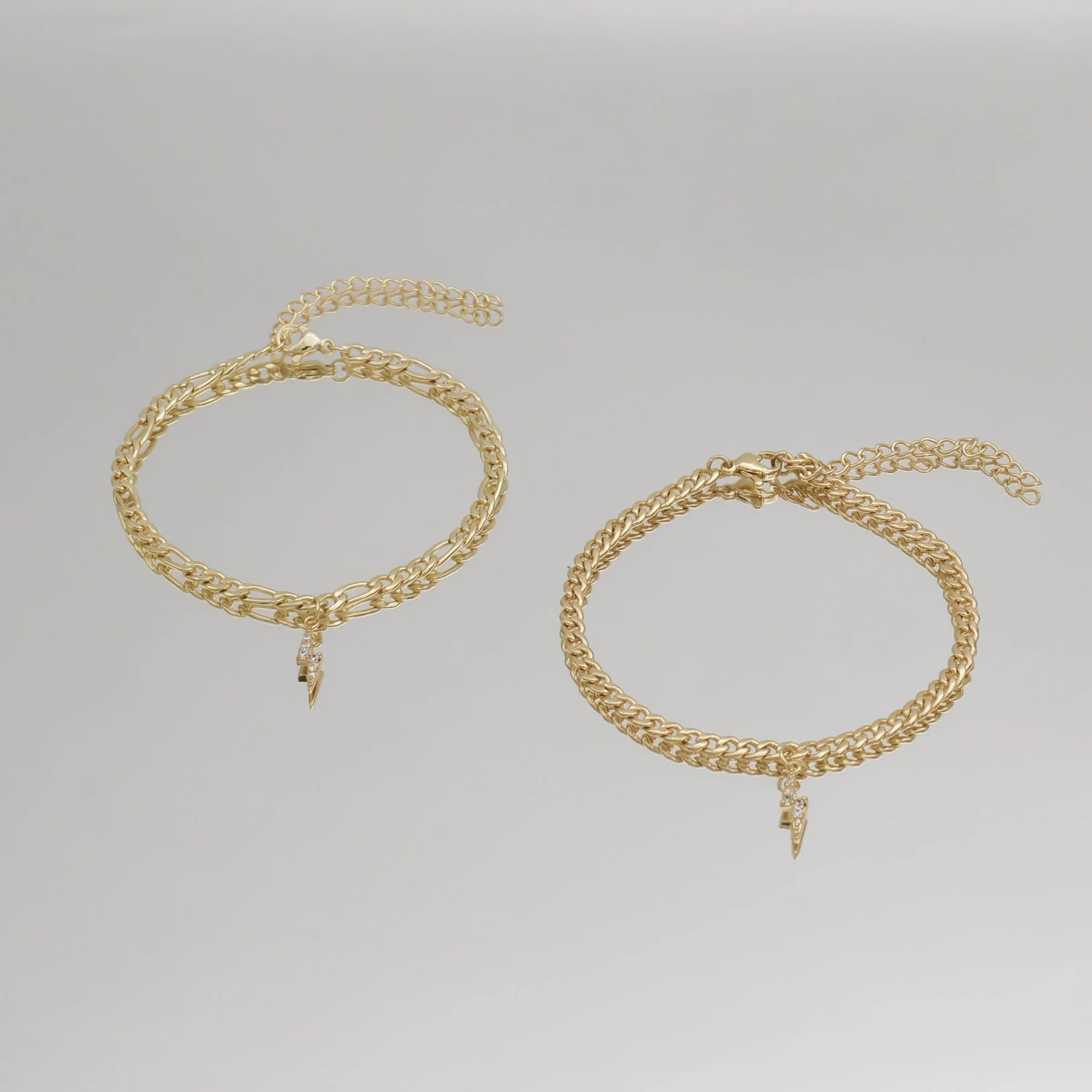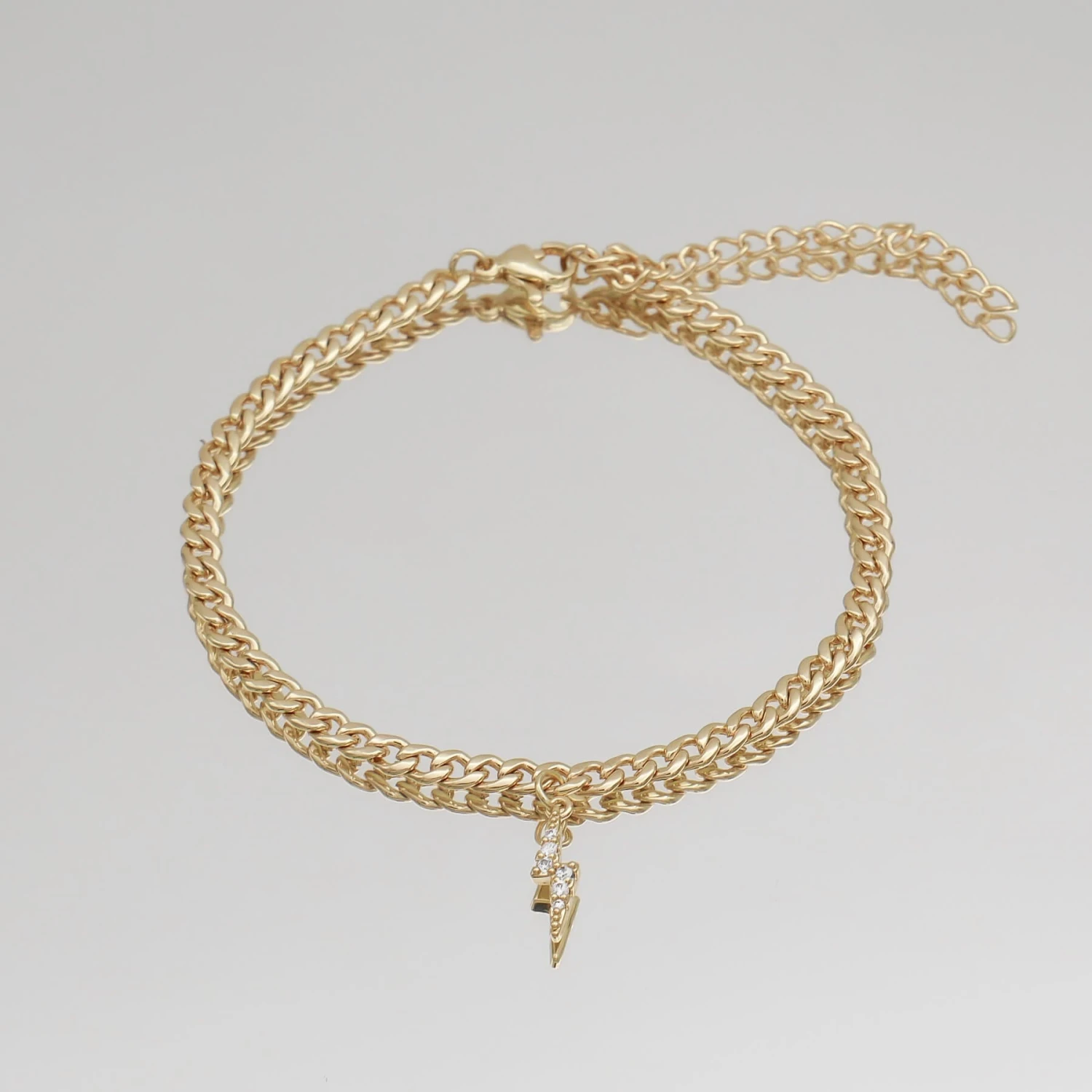 Offering a symbol of creativity, add a touch of edge with our ICY lightning bolt cuban anklet. Featuring a carefully paved CZ single suspended lightning bolt attached to a cuban link chain. Style with a curation of layered gold anklets for a subtly striking finish.
