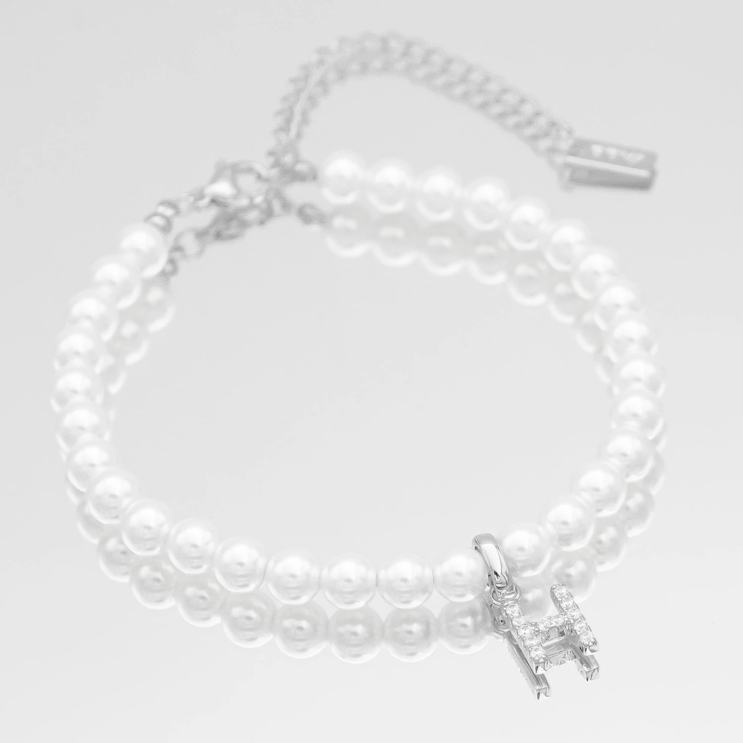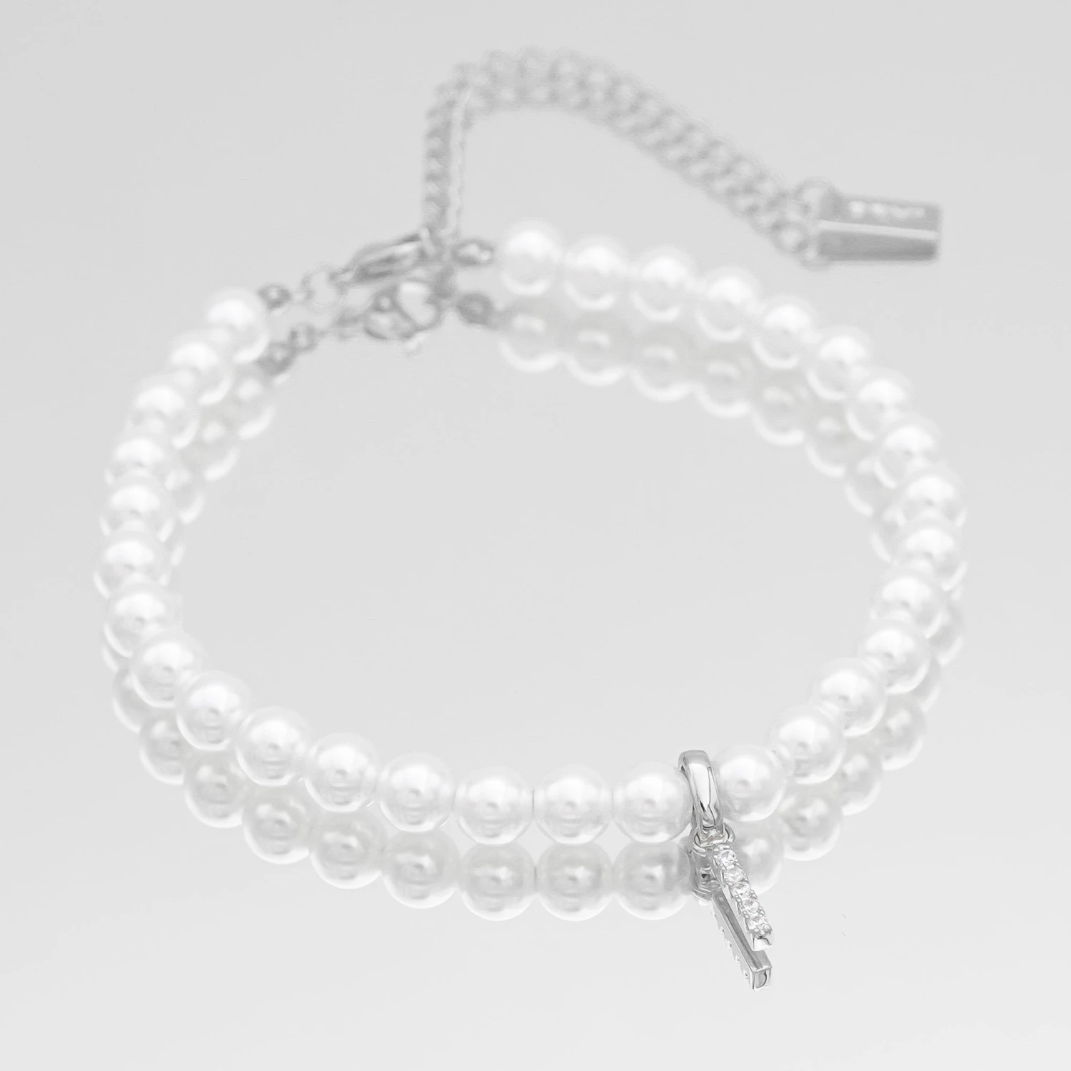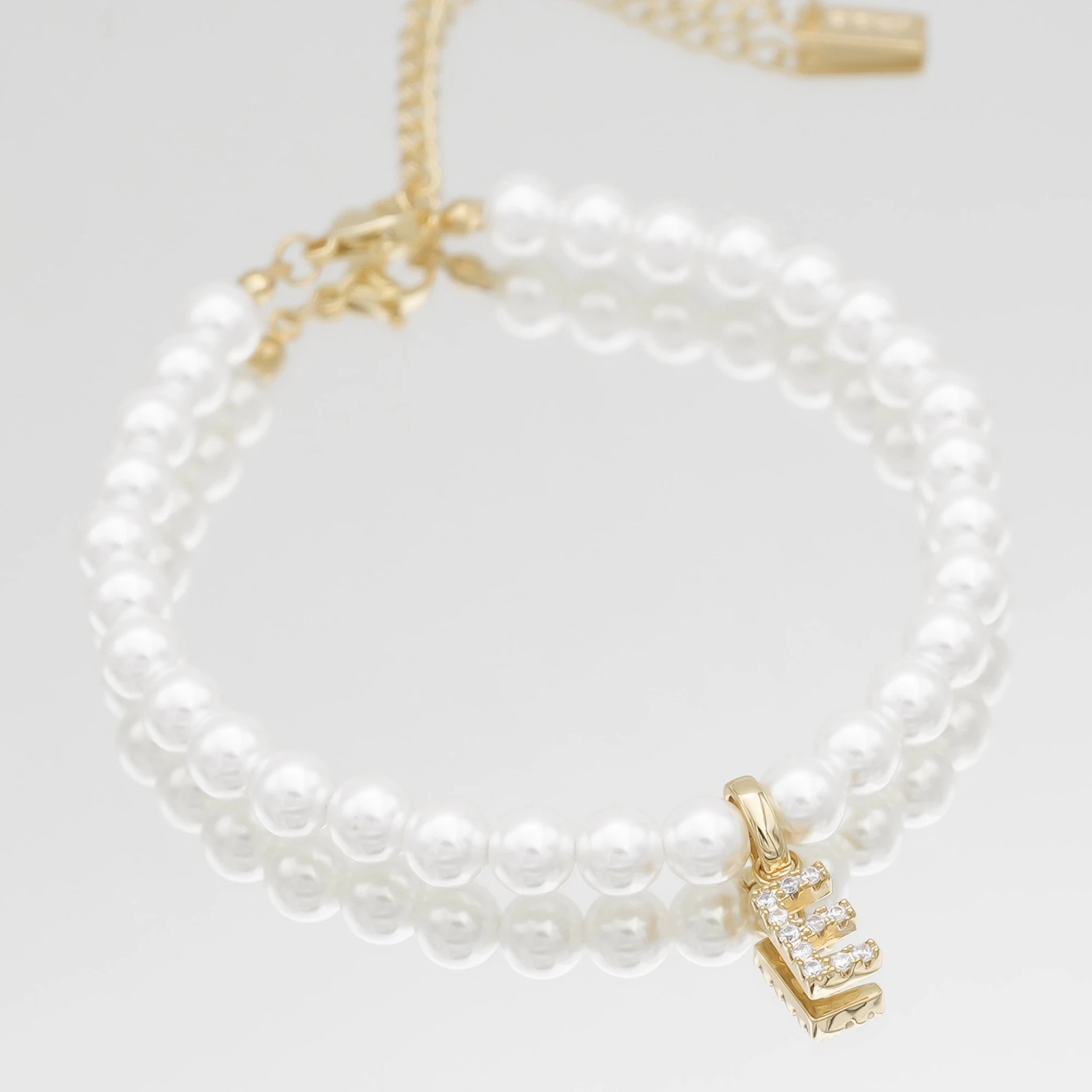 Our classy Pearl Initial Bracelets feature a beautifully encrusted Initial hung on our stunning pearl chain bracelet. This elegant piece is sure to create an eye-catching look. Match with our Pearl initial Necklace & Anklet to complete the ultimate pearl collection look.