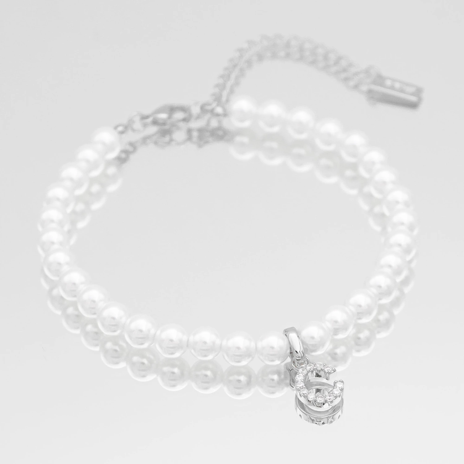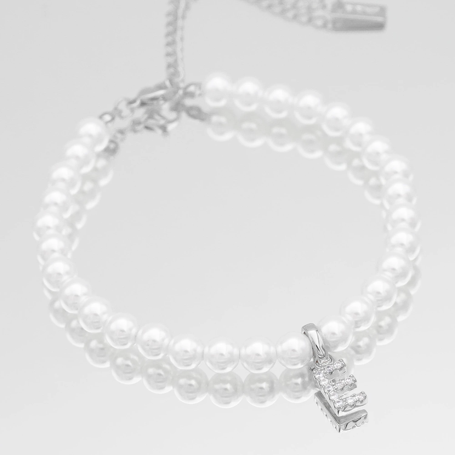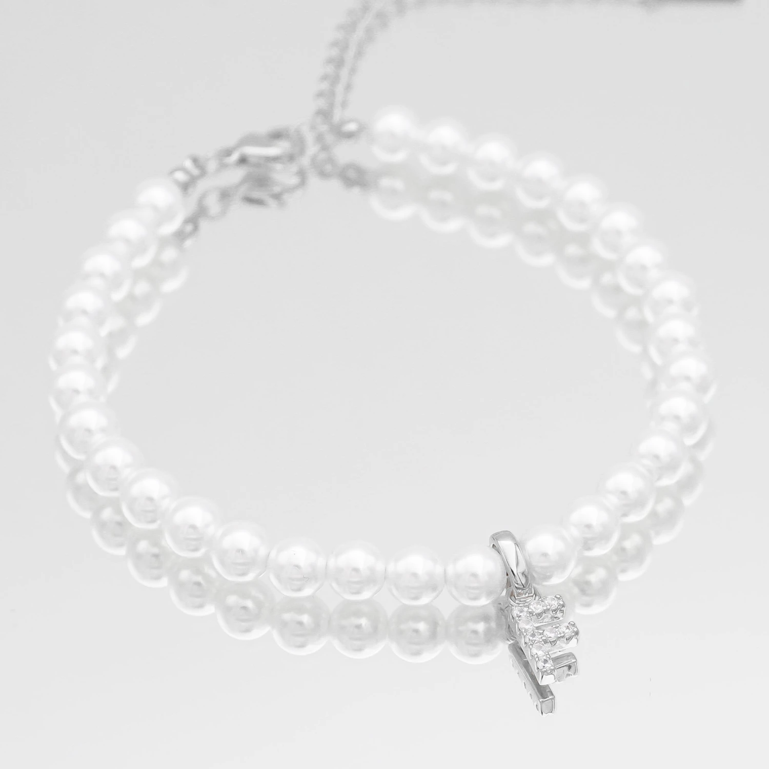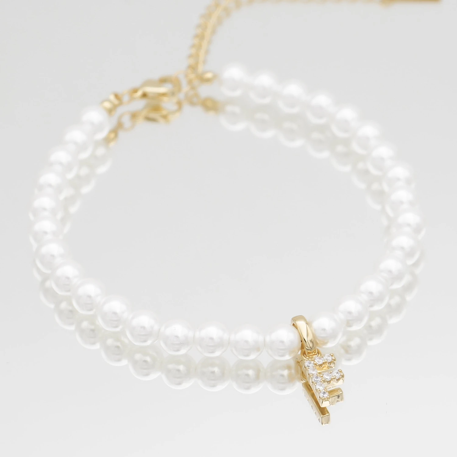 Our classy Pearl Initial Bracelets feature a beautifully encrusted Initial hung on our stunning pearl chain bracelet. This elegant piece is sure to create an eye-catching look. Match with our Pearl initial Necklace & Anklet to complete the ultimate pearl collection look.