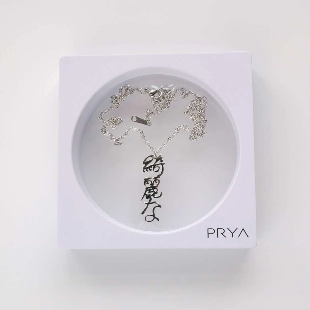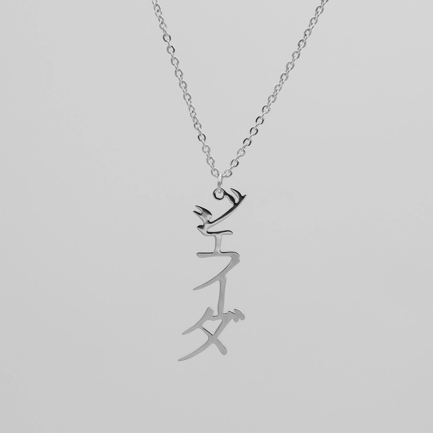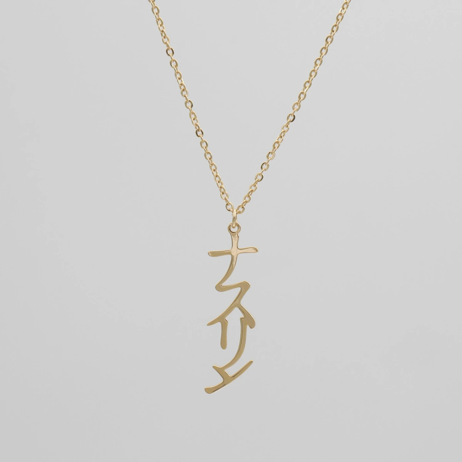 Our Japanese Name Necklace offers a unique twist on personalised jewellery, featuring your chosen name or word in Kanji script along a vertical Tategaki axis. This beautifully crafted solid metal pendant boasts thin, delicate proportions for comfortable wear. We also have the traditional horizontal custom Japanese name necklace if you love the flat style.