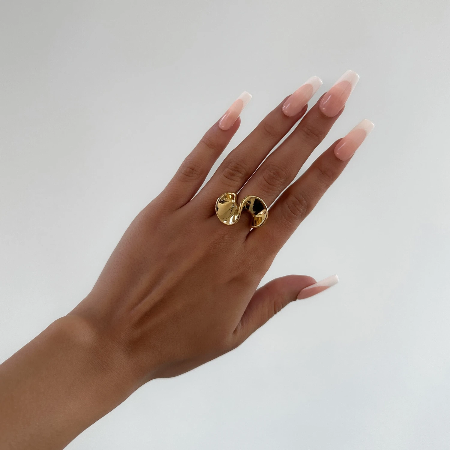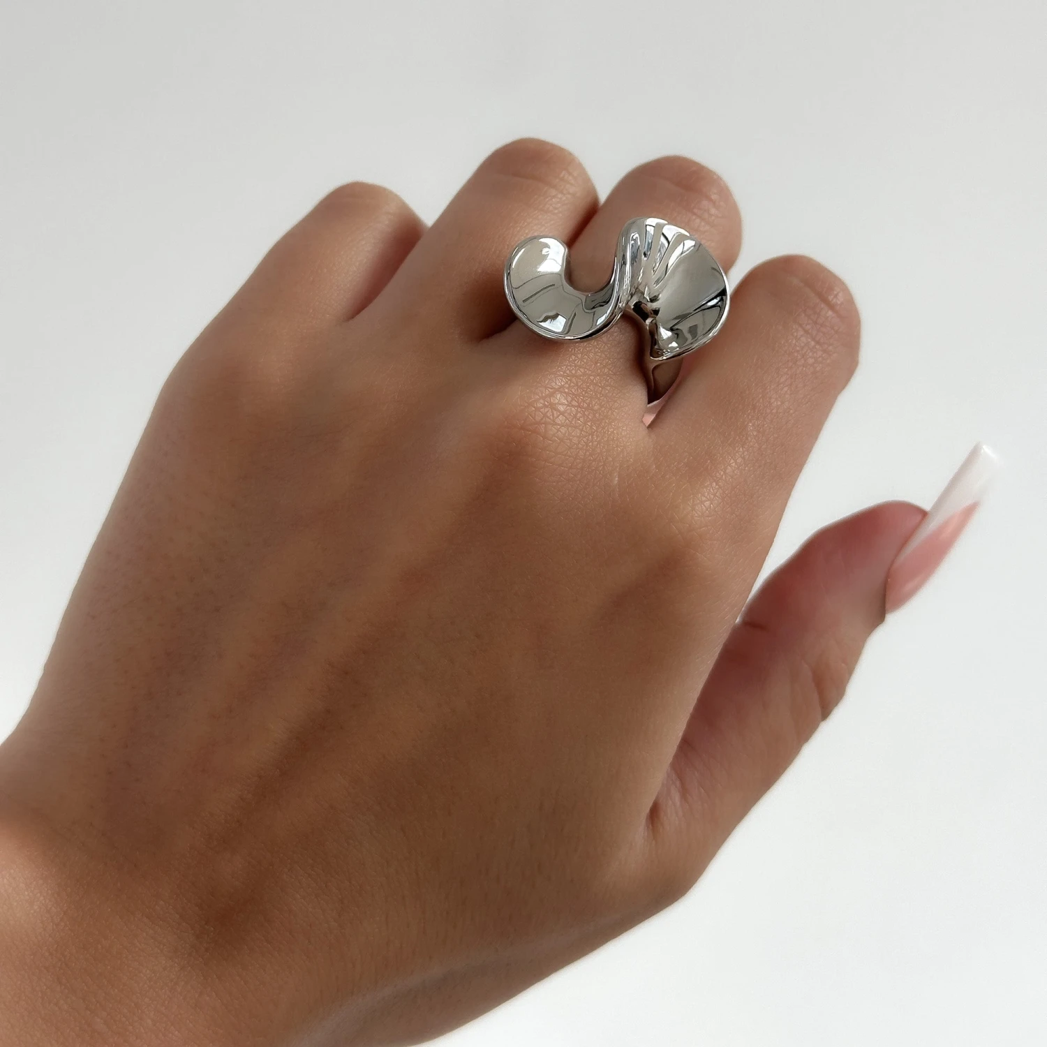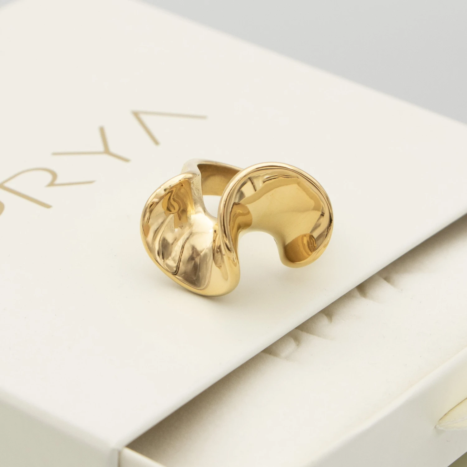 The Juna Ring is a striking piece, perfect for adding dimension to your jewellery stack. Featuring a bold, twisted gold or silver plated band, this ring offers a unique blend of modern elegance and timeless charm. Its abstract, asymmetric design with soft shapes brings a contemporary edge, making it a standout accessory.