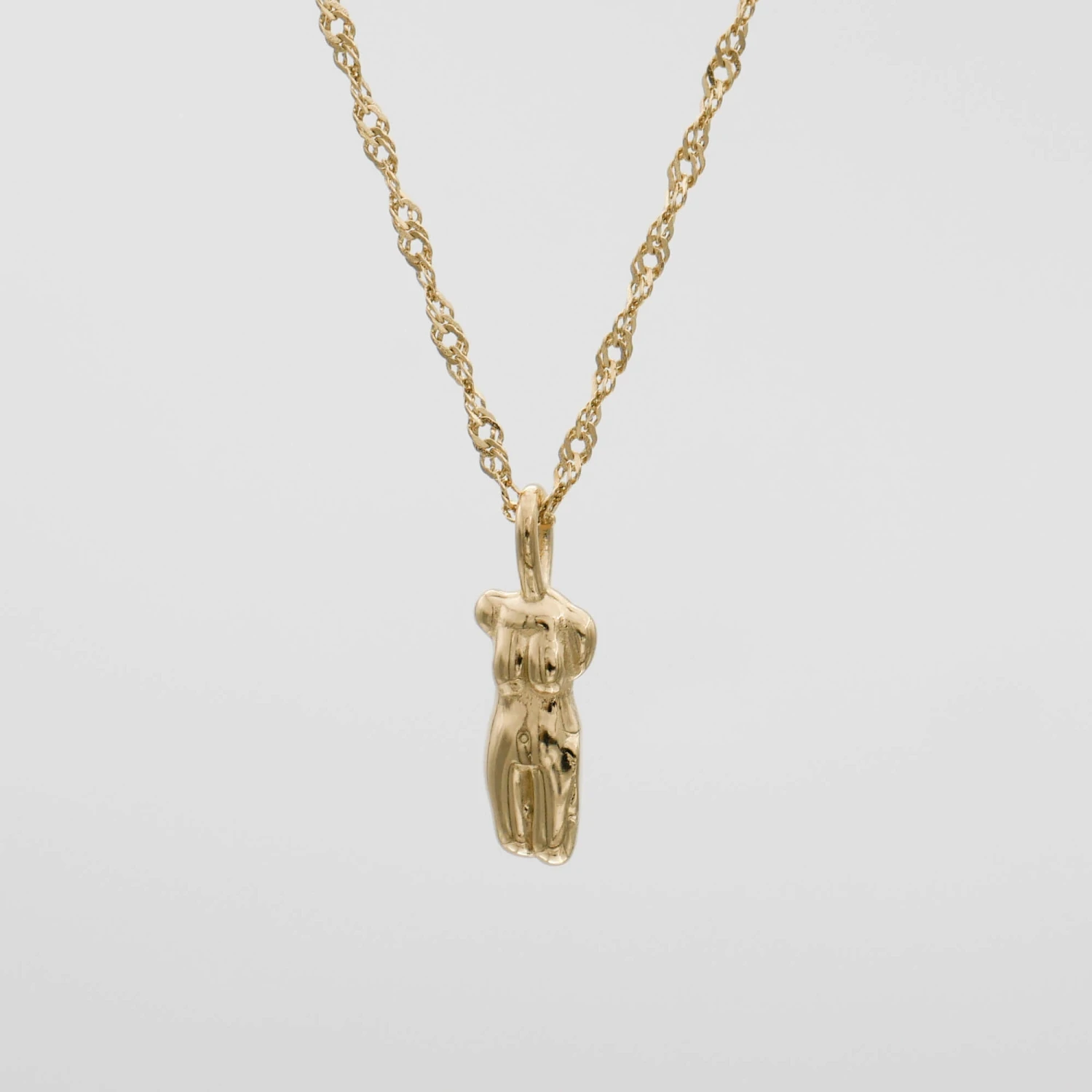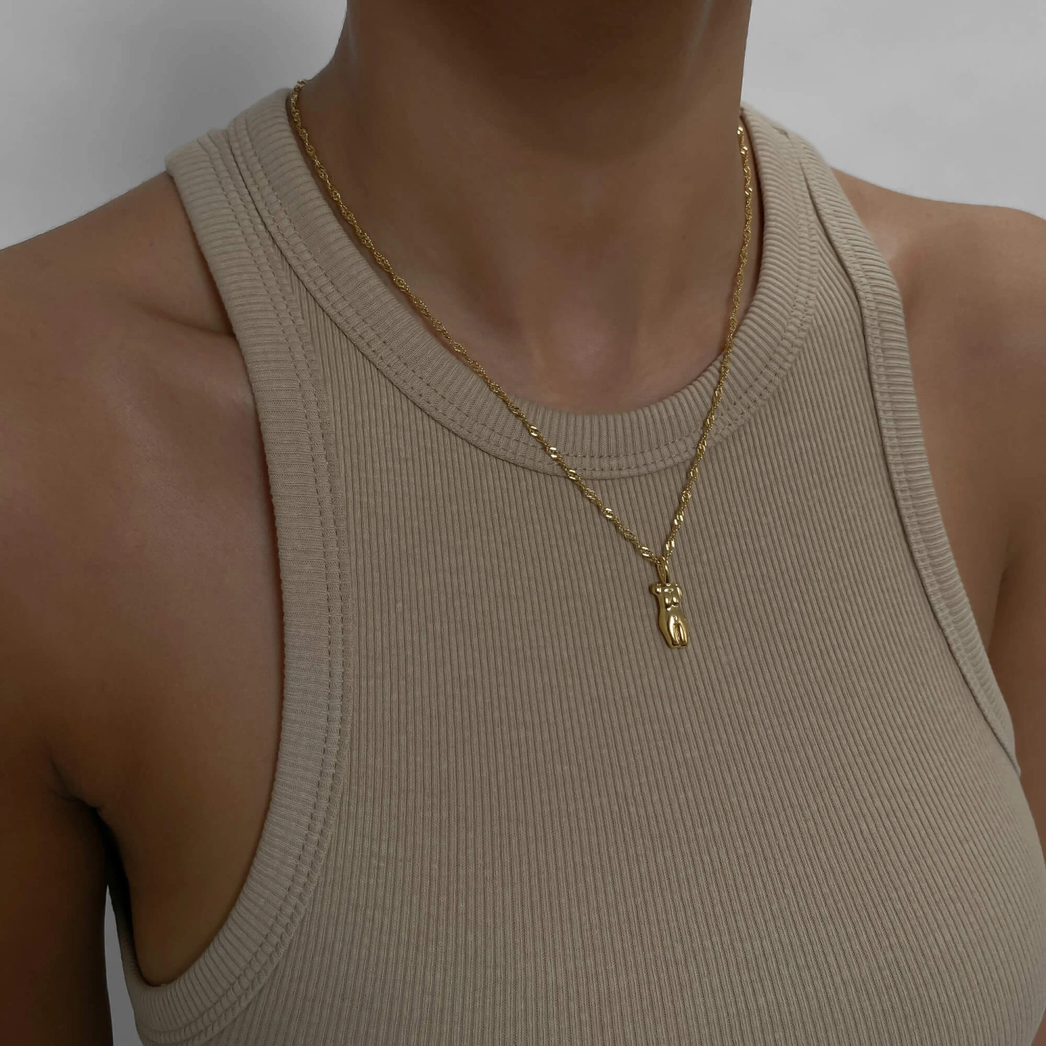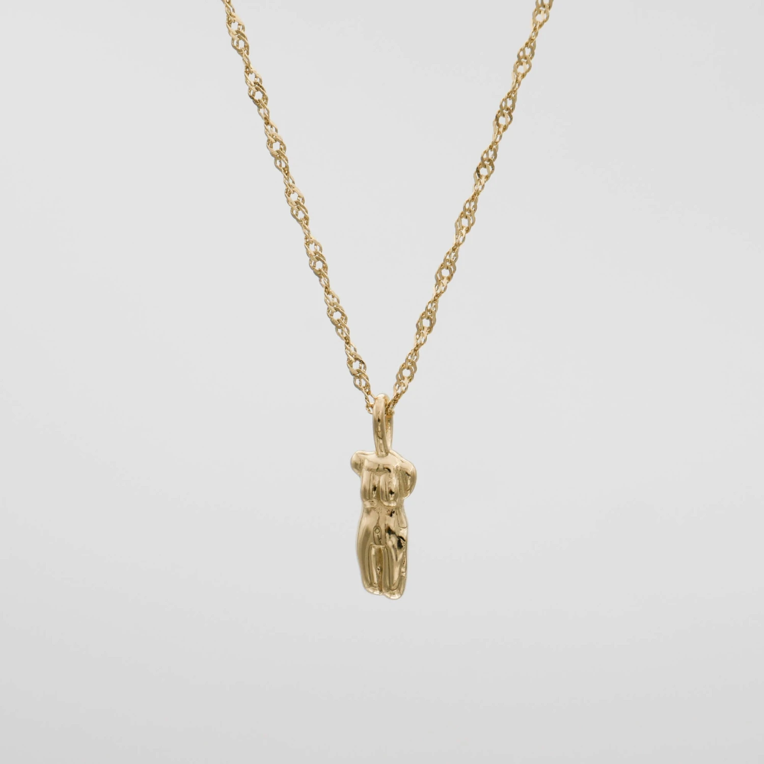 This dainty Figure Necklace adds an elegant finish to any look. Featuring a beautifully sculptured female body figure in 18k gold plated stainless steel suspended on our twisted water wave chain.