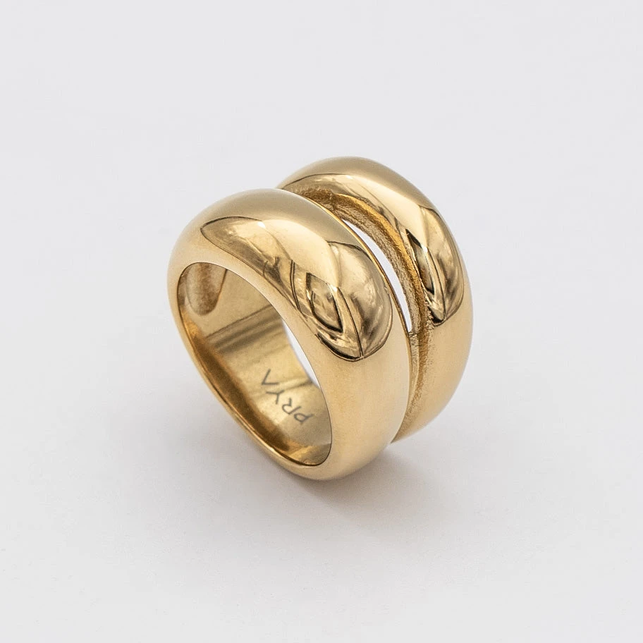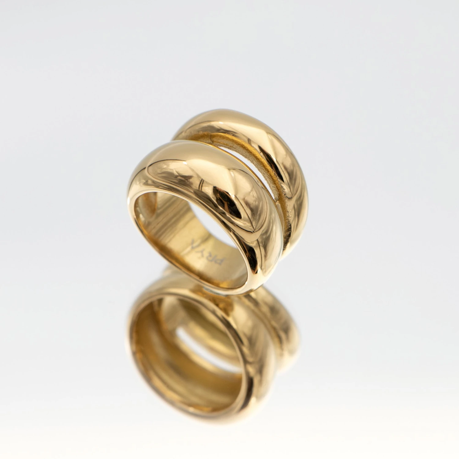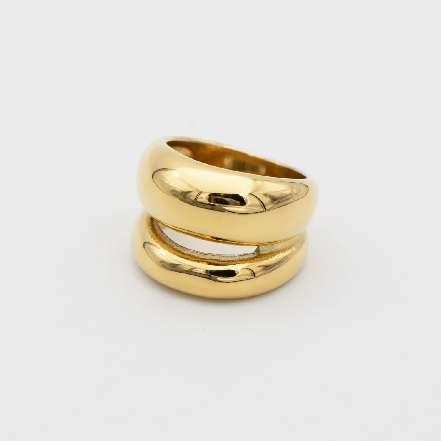 Dress your hands with our Layla Statement Ring, a chunky Gold piece featuring a bold, double band design. This eye-catching dome shaped ring is Ideal for ring stacking, and adds a touch of modern sophistication to any look. Make a statement and pair it with your favourite delicate rings.