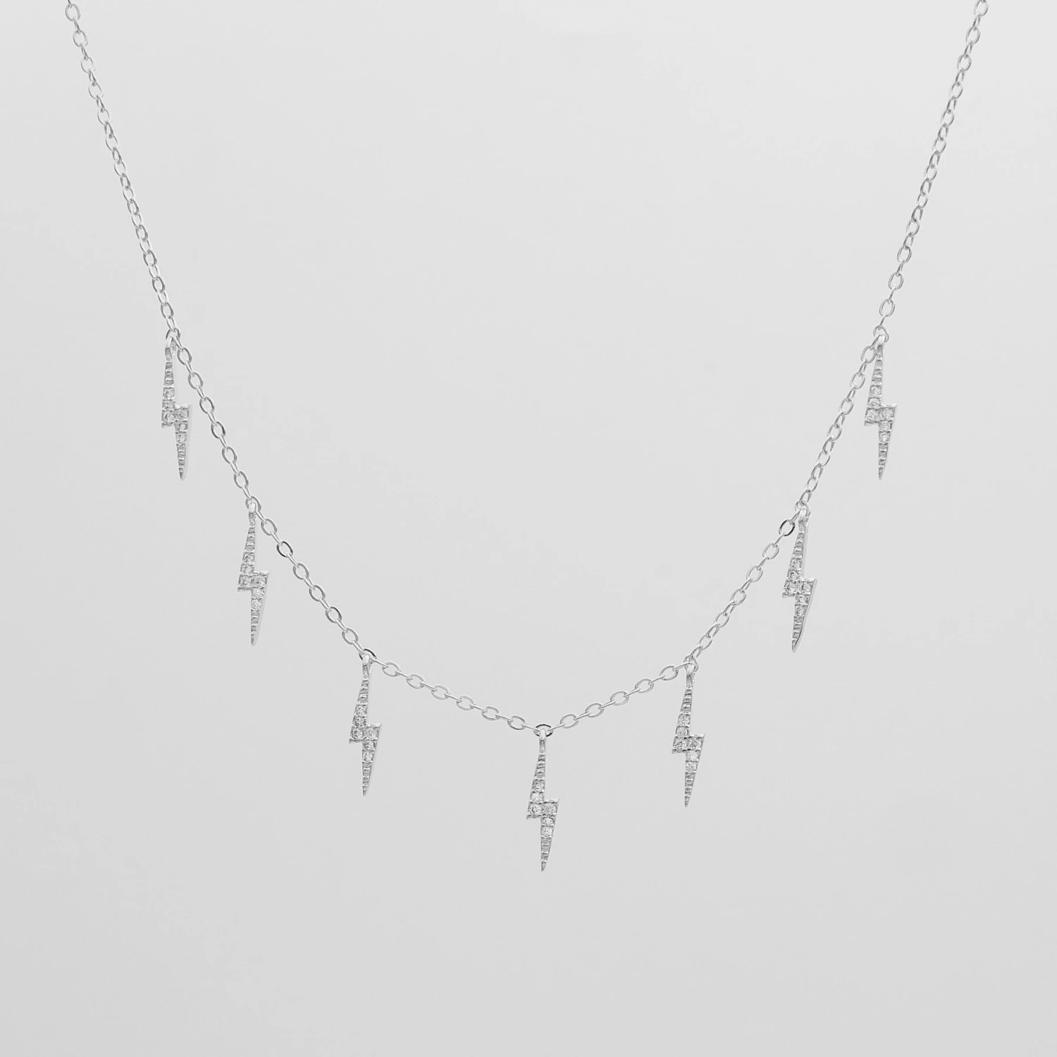 This dainty elegant choker features seven suspended lightning bolts all featuring beautiful CZ Crystals. Choose between 18k Gold or Silver plated. Let it shine on its own or layer with other necklaces