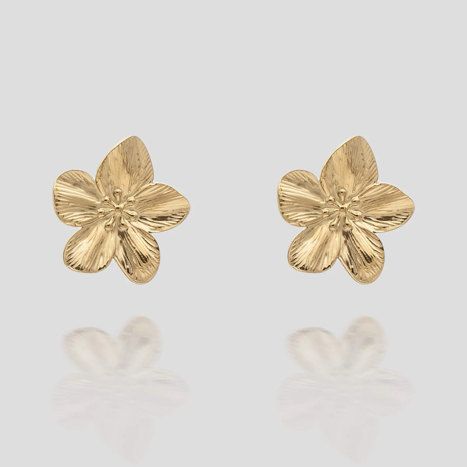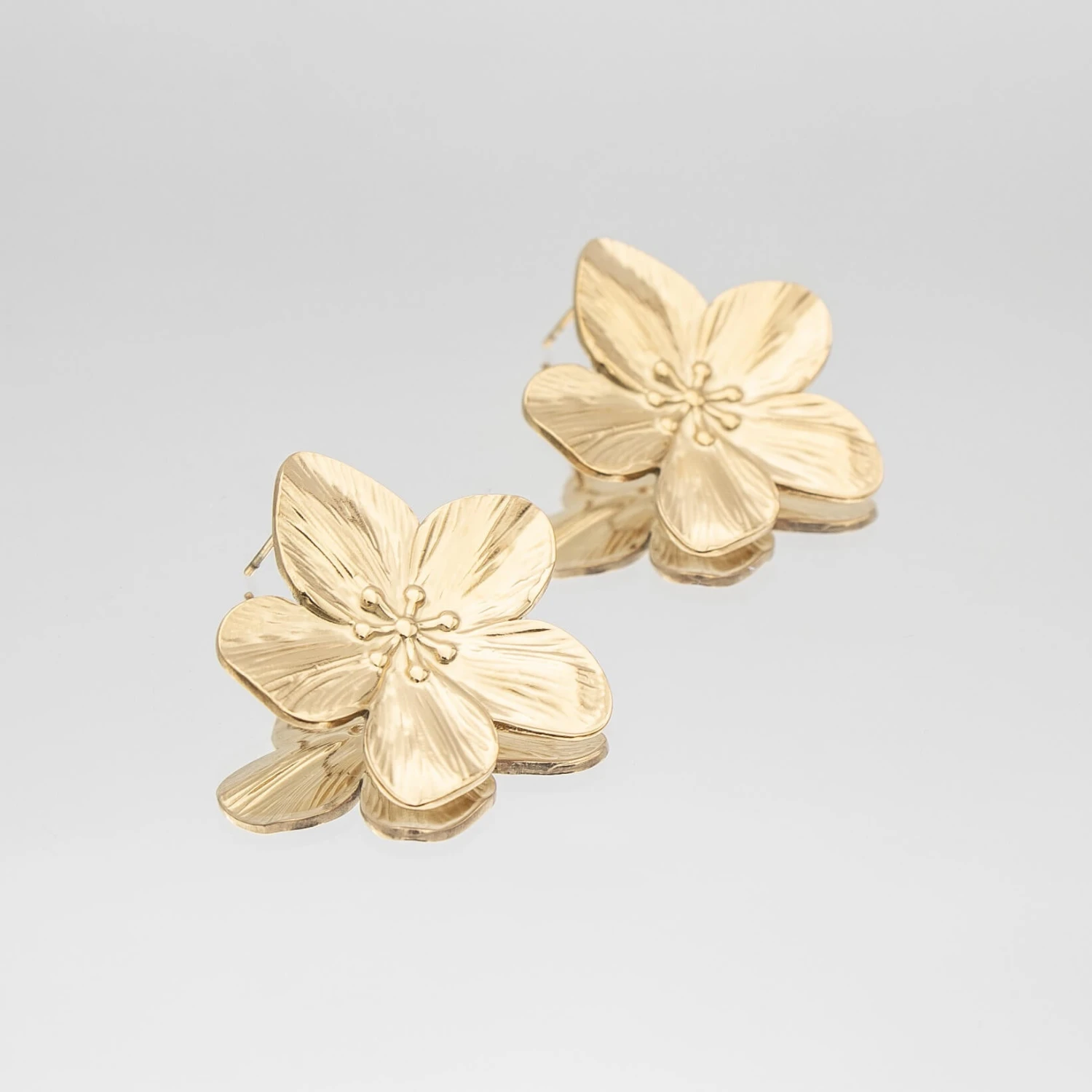 The Naya Gold Earrings feature a stunning design inspired by the delicate hibiscus flower. With textured petals that radiate a warm, golden glow, these earrings combine both drop and stud styles for versatile elegance. Plated with luxurious gold, they offer a statement of natural beauty and sophistication.