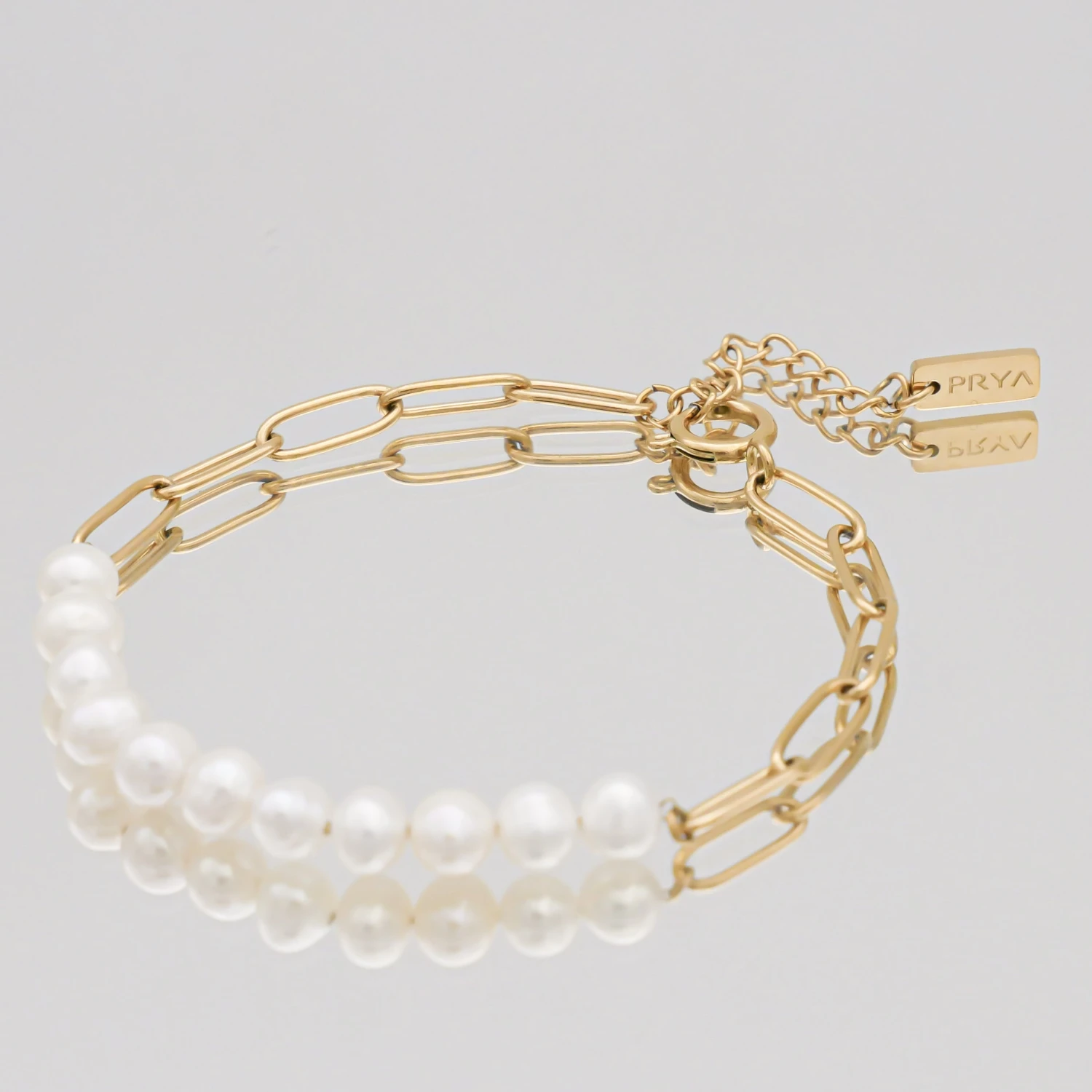 Our stunningly unique Pearl Bracelet features a mixture of paperclip links and stunning pearl beads. This beautiful piece is sure to create an eye-catching look. Match with our Camila necklace to complete your look.