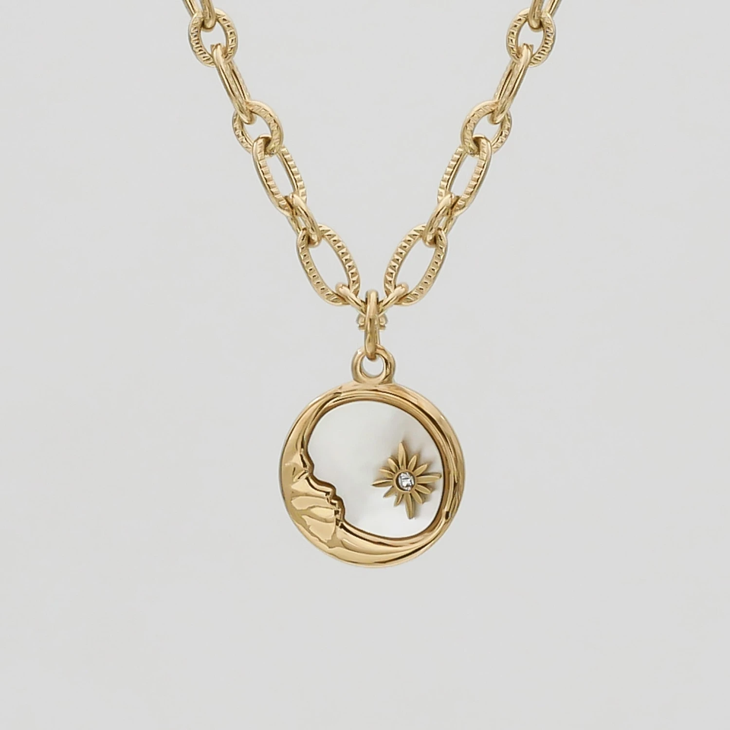 The round pendant is suspended on a stunning hammered paper clip chain that adds texture and movement to the necklace. The metal bail hangs in the centre of the chain and attaches to the pendant with a small loop at the top of the pendant. The round-shaped pendant is bordered with polished detailing. The beautiful Moon detailing is set as the star of the show. The necklace is fastened with a classic trigger clasp, making it super easy and comfortable to wear. Layer with your favourite choker or wear it alone as a statement piece.