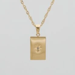 The necklace uses an exquisite wave chain to draw the eye toward the wearer. The pendant is attached to the chain with a rounded metal necklace bail which attaches directly to the tablet with a small loop. The tablet is made from 18K gold plated stainless steel and is rectangular in shape. It has a solid depth and straight edge. The tablet has a plain gold background with the detail-focused in the centre. The starlight is created with an engraved star design in the middle. It has eight grooved points that slope upwards and outwards. In the centre of the star is a clear cubic zirconia gem. The necklace is fastened using a classic trigger clasp, making it easy to put on and take off. Wear its own as a statement or layer with our other personalised necklaces for that complete custom look. Layer with our personalised name necklaces available – HERE