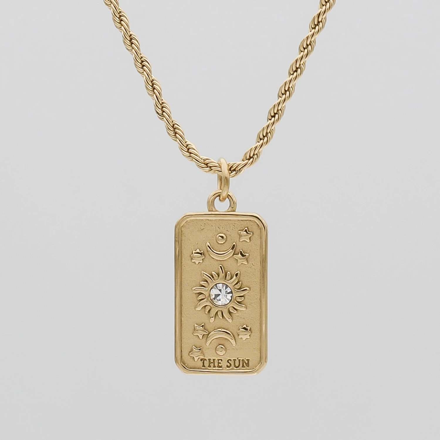 The Sun Tarot Card Necklace is crafted in 18k cold plated stainless steel. It features an intricate design on a tablet pendant suspended from a beautiful rope chain. The chunky chain counters the dainty detailing of the pendant with its textured weight. The pendant is attached to the chain with a small loop that connects to a larger hoop that rests along the chain. The tablet is rectangular with rounded edges and a slight lip around the edge. The design features a central sun crested with a clear cubic zirconia crystal bezel set in the centre of the sun. The sun is surrounded by a solar system of moons and stars. The name of the card, ‘THE SUN’ is embossed on the lower edge of the tablet. All these beautiful detailing offer a unique and accurate take on tarot as jewellery.