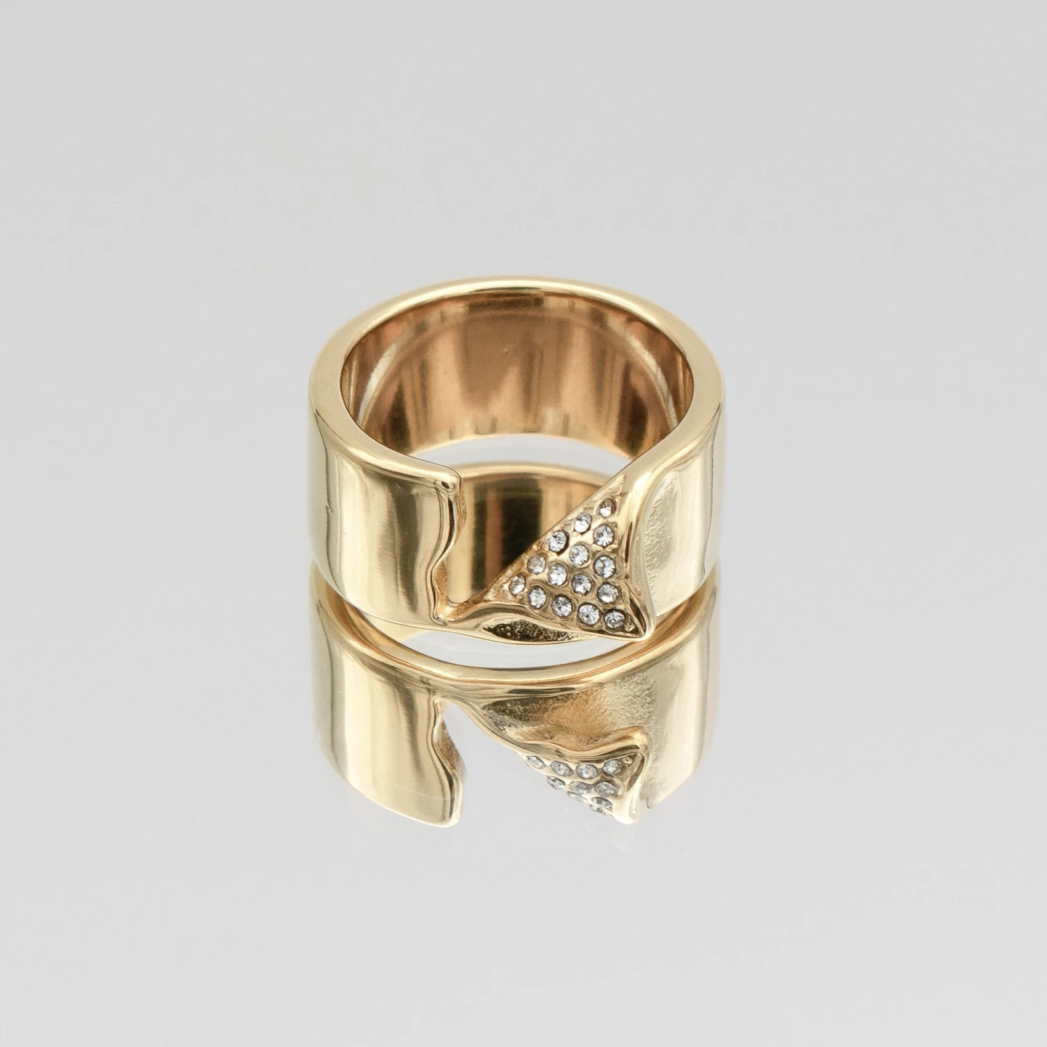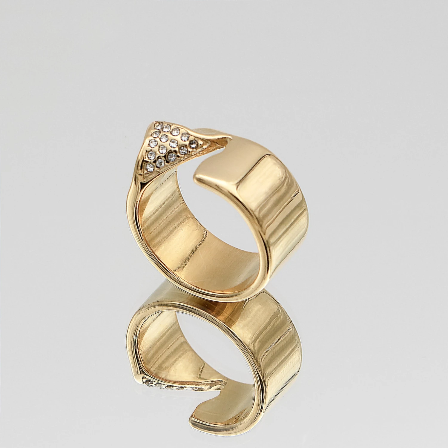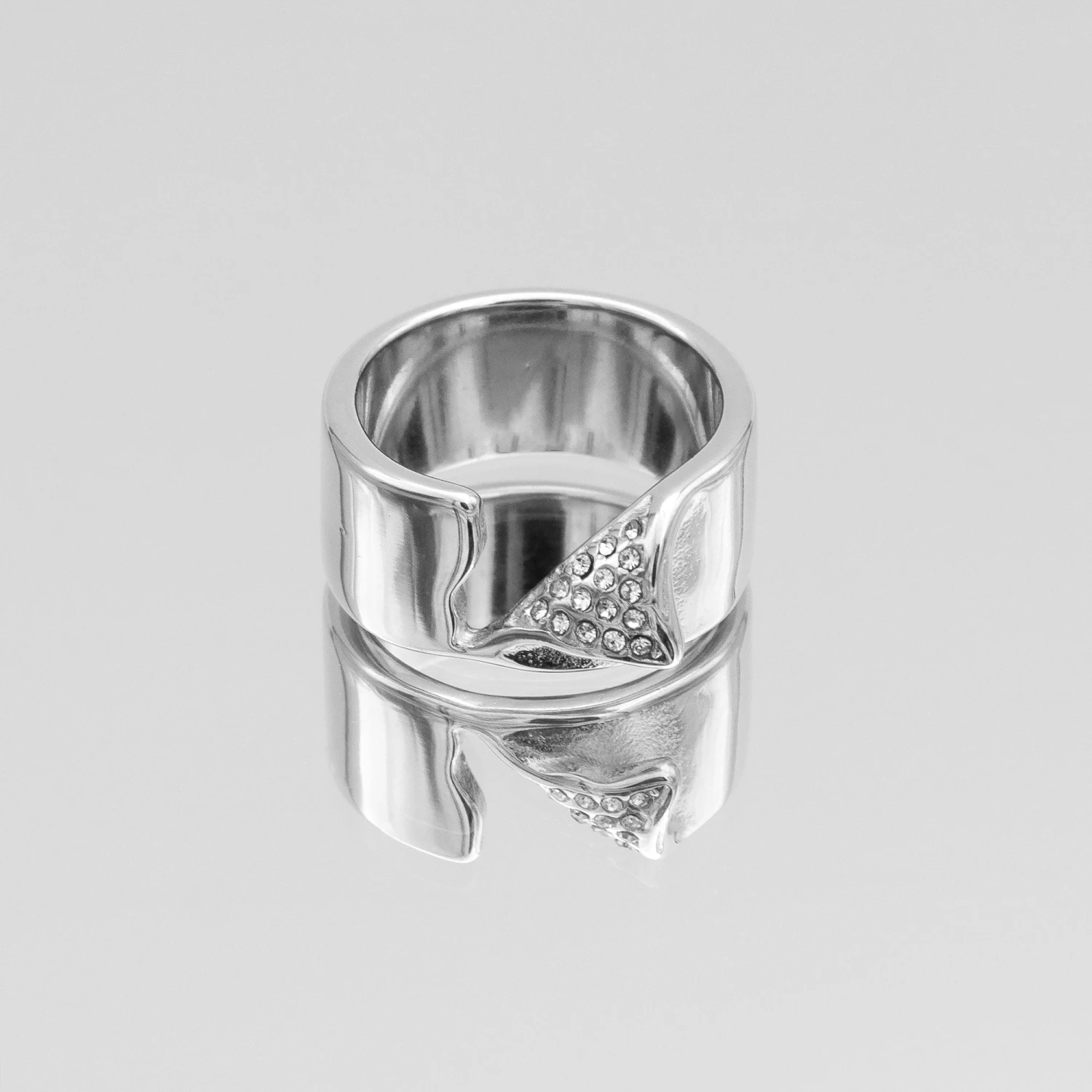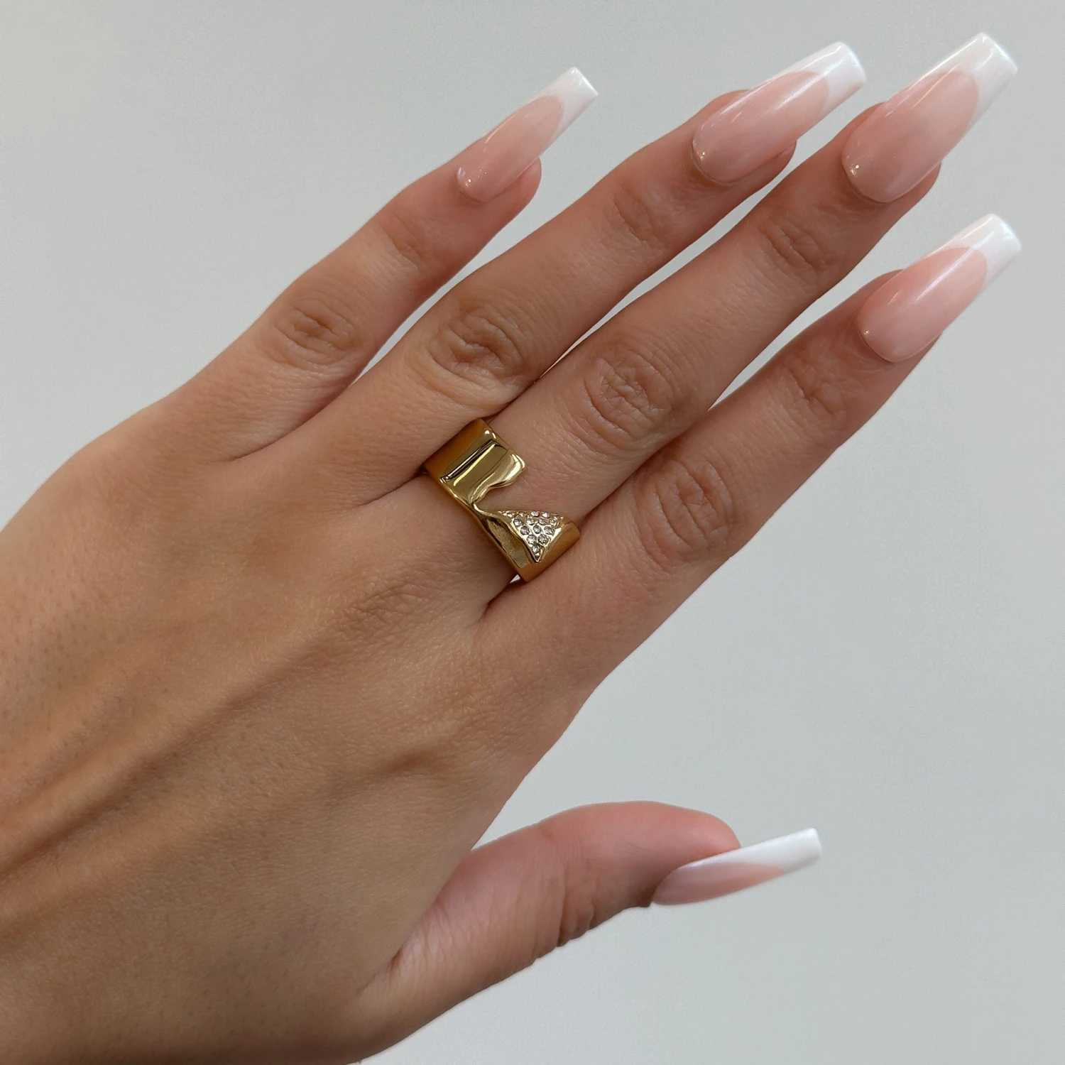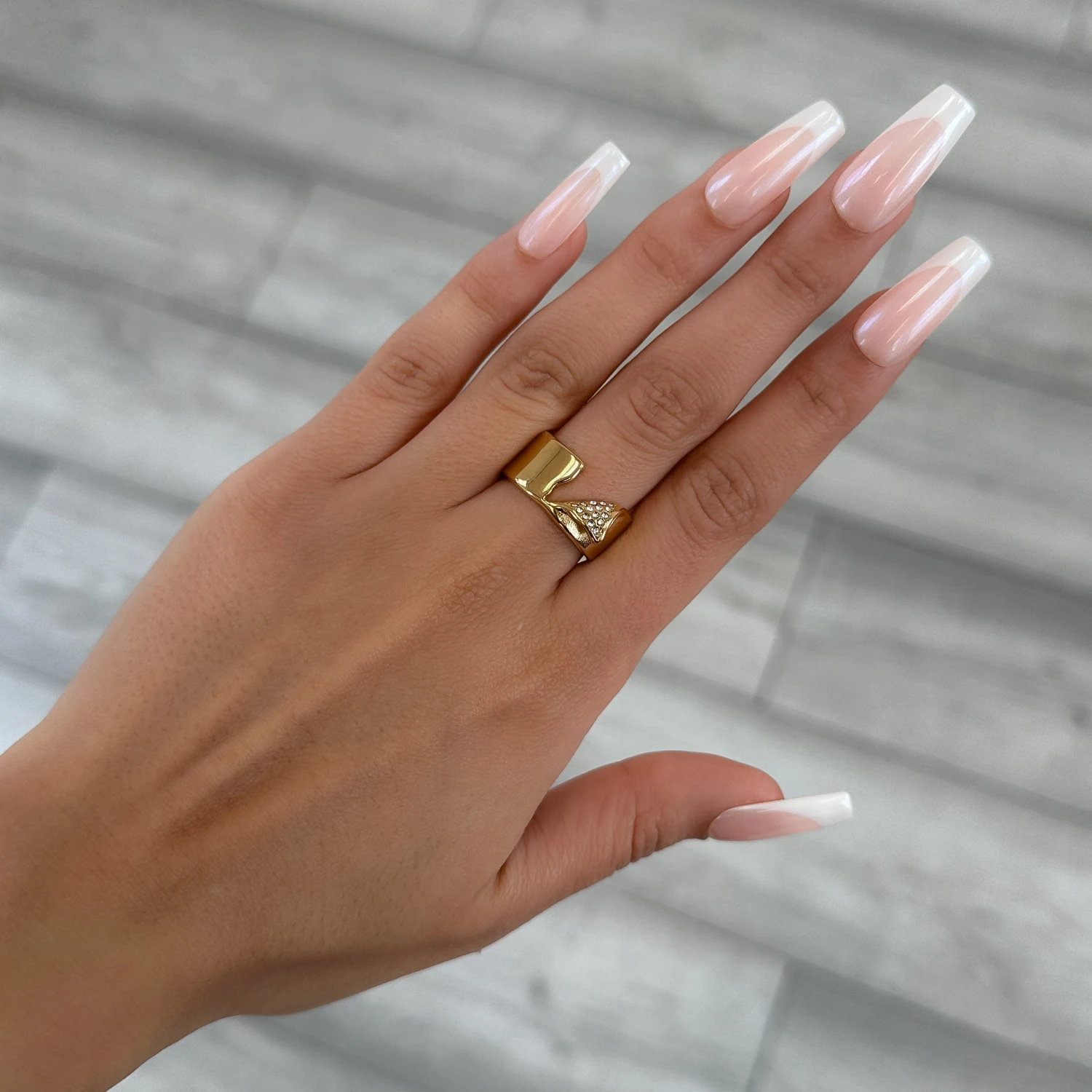 Elevate your style with the Zuri Cut-Out Band Ring. The wide asymmetrical band boasts smooth, flowing curves and a modern shape, enhanced with shimmering CZ stones that unravel and catch the light. Make a bold and sophisticated statement with this contemporary ring.