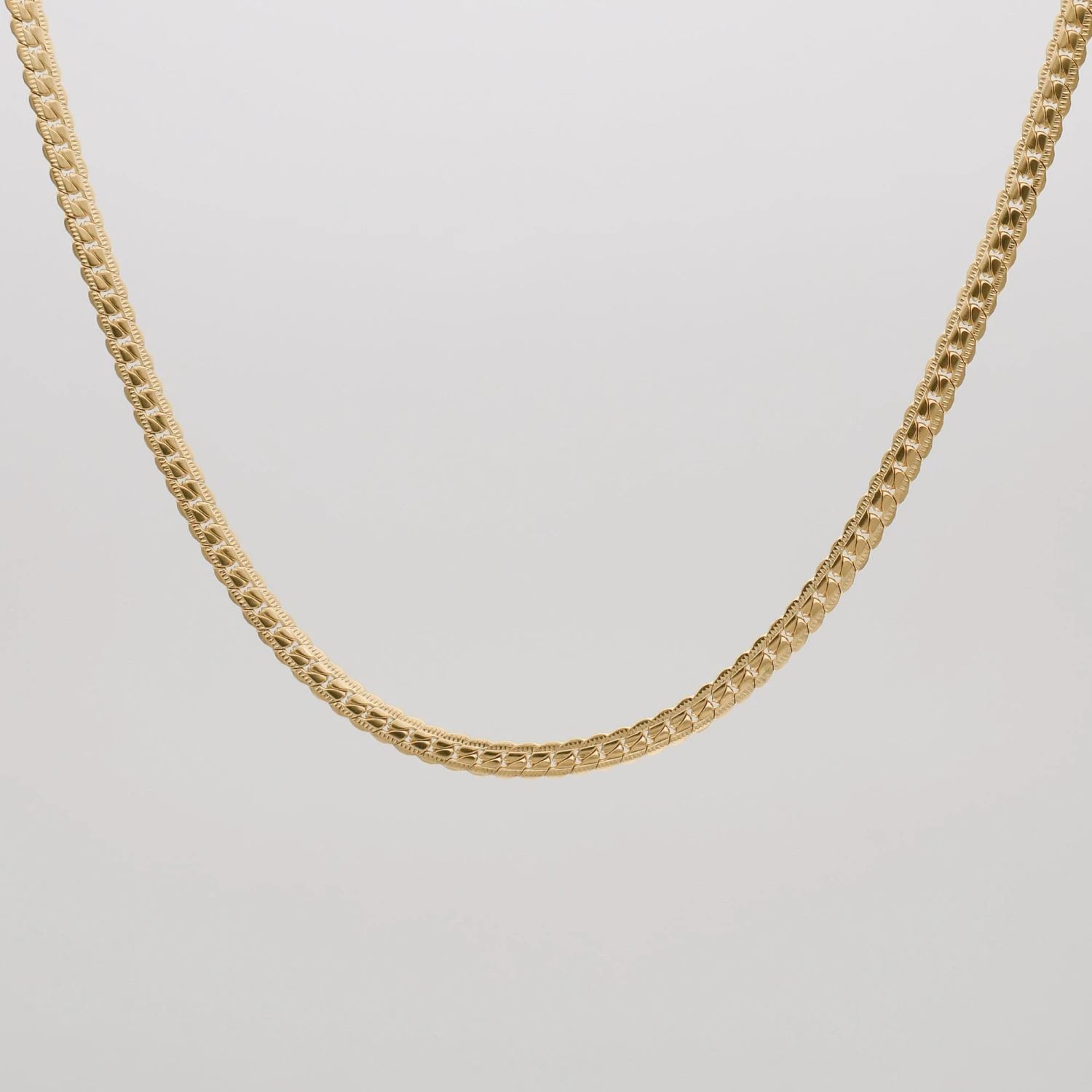 The Zuri Hammered Curb Chain is a versatile piece, available in various sizes and metals to suit any style. Featuring a hammered curb chain design with flattened edges, it sits flush against the chest for a sleek look. The chain is made from 18K gold-plated or silver-plated stainless steel, it’s tarnish-free and water-resistant. With lengths of 35cm, 40cm, and 45cm, plus different thickness options, it’s perfect for creating a custom layered look or mixing with other chains and pendants.